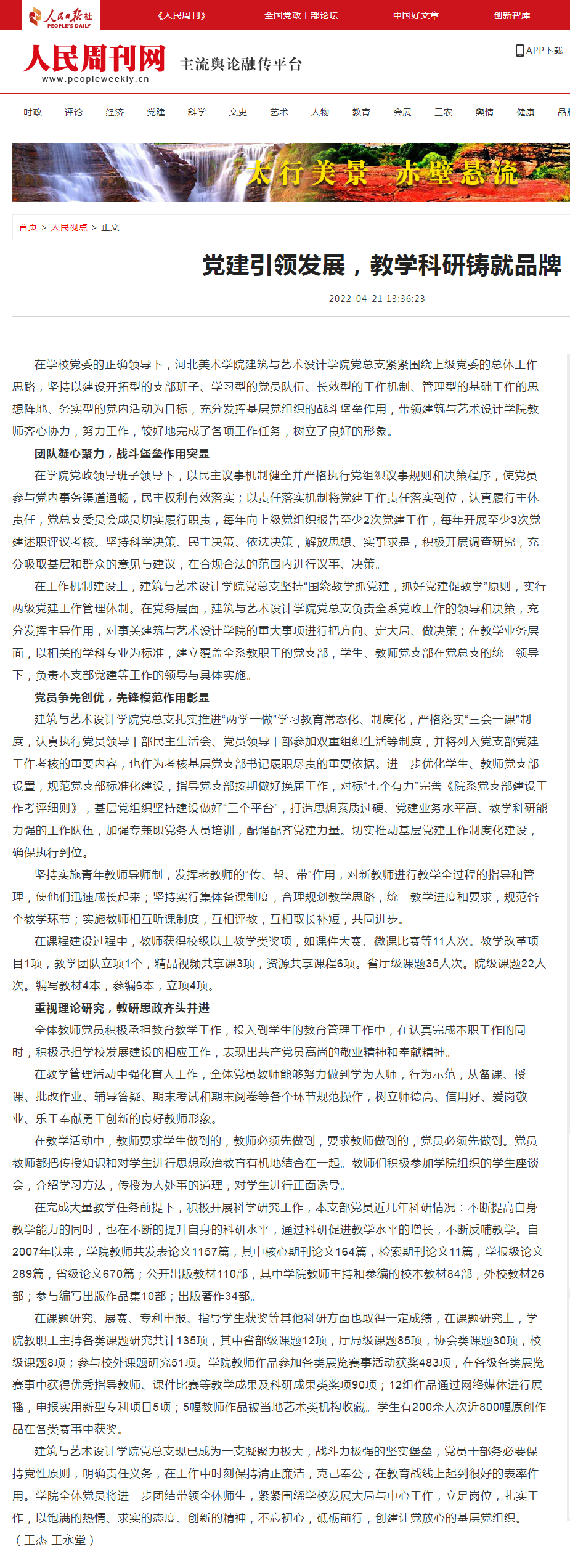 4月19日,人民日报河北站记者专访best365官网建筑与艺术设计学院党总支书记王杰、第二支部书记王永堂,并在人民周刊网刊文《党建引领发展,教学科研铸就品牌》,介绍了建筑与艺术设计学院的党建工作,重点突出了党建活动的品...