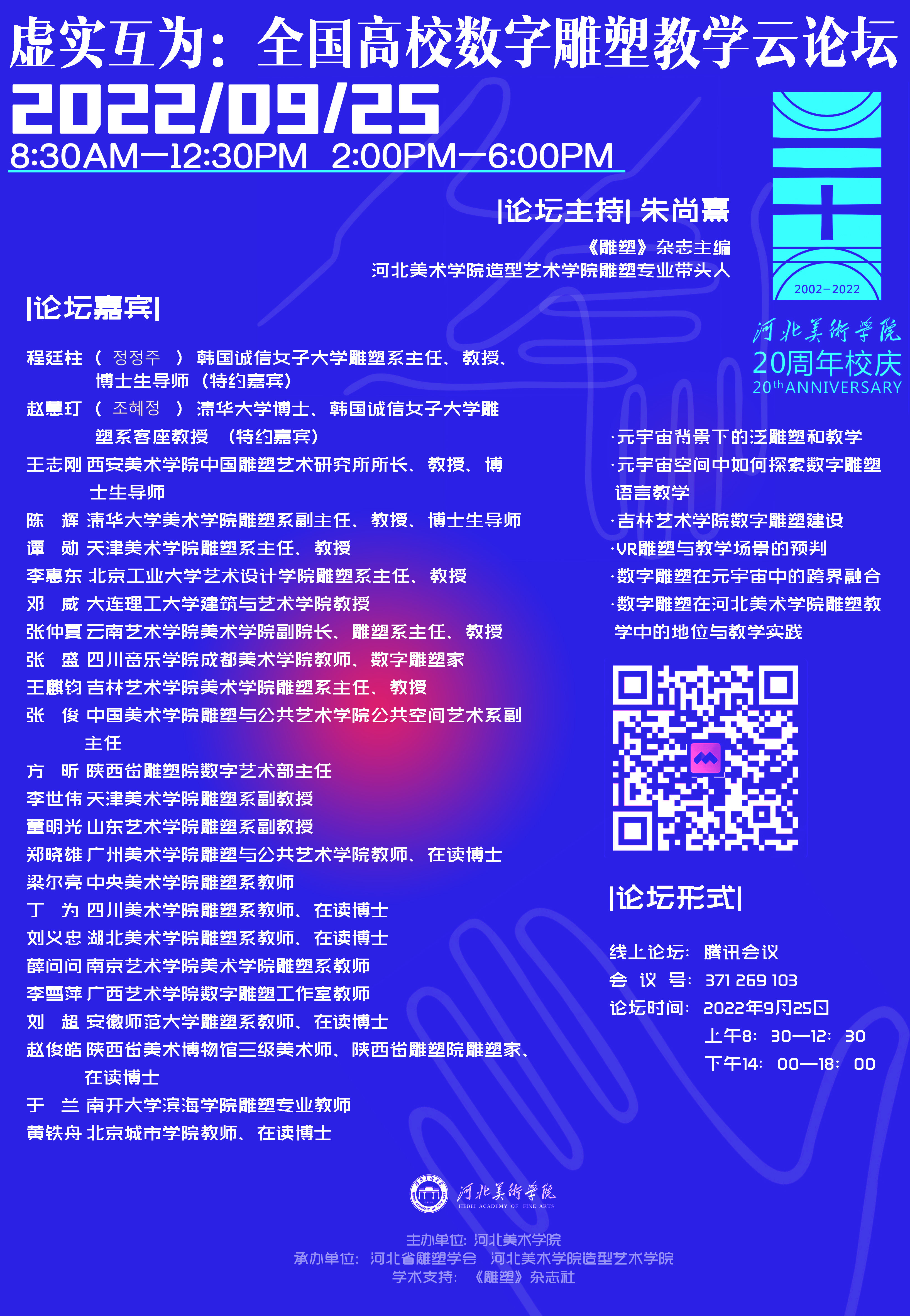 9月25日上午8:30,由best365中国官方网站主办,河北省雕塑学会、best365中国官方网站造型艺术学院承办,《雕塑》杂志社作为学术支持单位的“虚实互为:全国高校数字雕塑教学云论坛”开幕。校领导甄忠义、甄墨、张子言与来自全国各地的23位专家学者共襄盛举。论坛由《雕塑》杂志主编、best365中国官方网站造型艺术学院雕塑专业带头人朱尚熹主持。朱尚熹主持论坛开幕朱尚熹对本次论坛的主题“虚实互为”做了简...