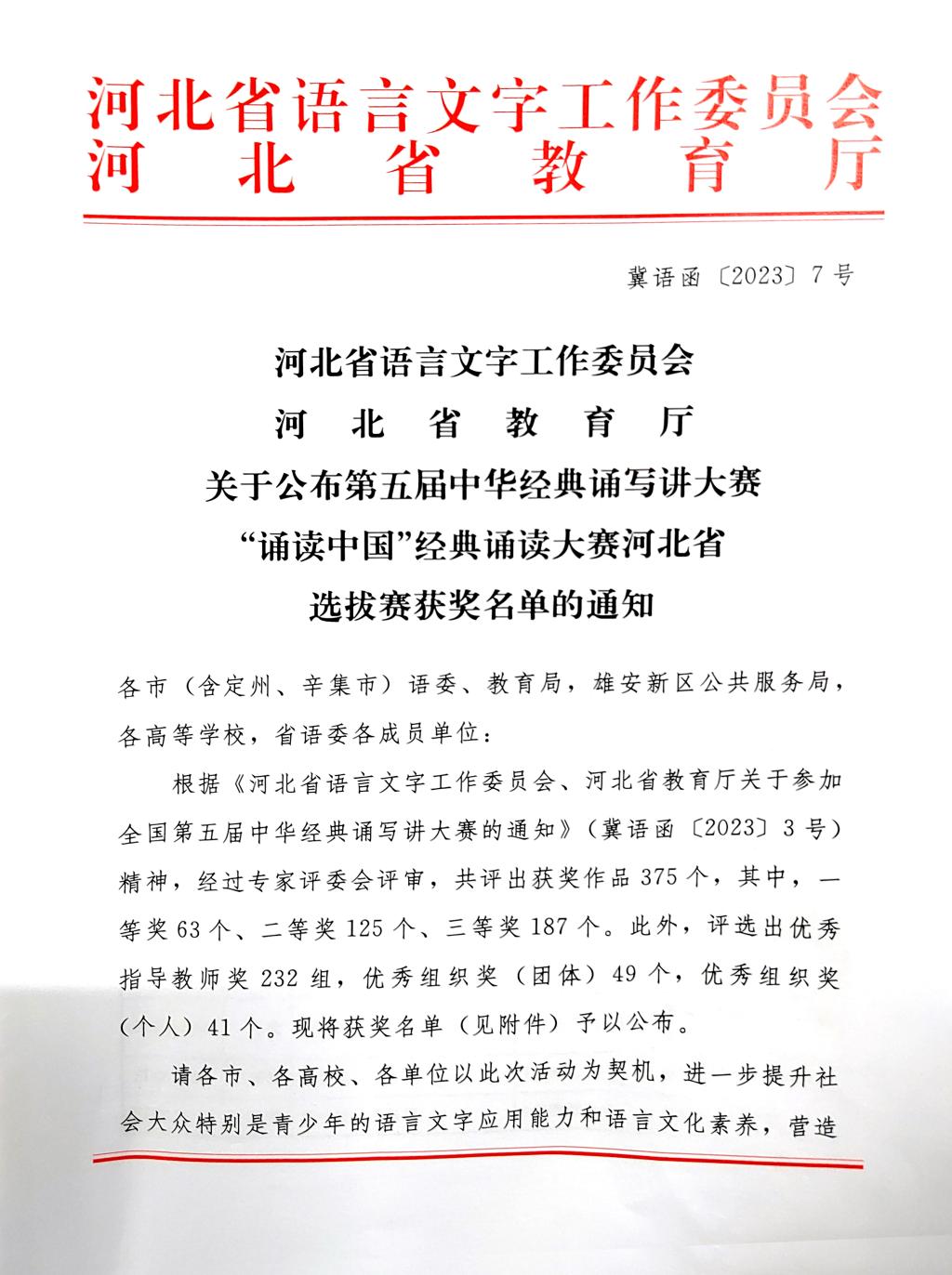 近日,河北省语言文字工作委员会、河北省教育厅下发《关于公布第五届中华经典诵写讲大赛“诵读中国”经典诵读大赛河北省选拔赛获奖名单的通知》冀语函【2023】7号。best365官网师生在本次大赛中取得优异成绩:学生组一等奖获1名、二等奖1名、三等奖4名,留学生获得三等奖2名,优秀指导教师获9名,学校获得优秀组织奖(团体)。在本次活动中,best365官网师生共同营造了爱读书、读好书、善读书的浓厚...