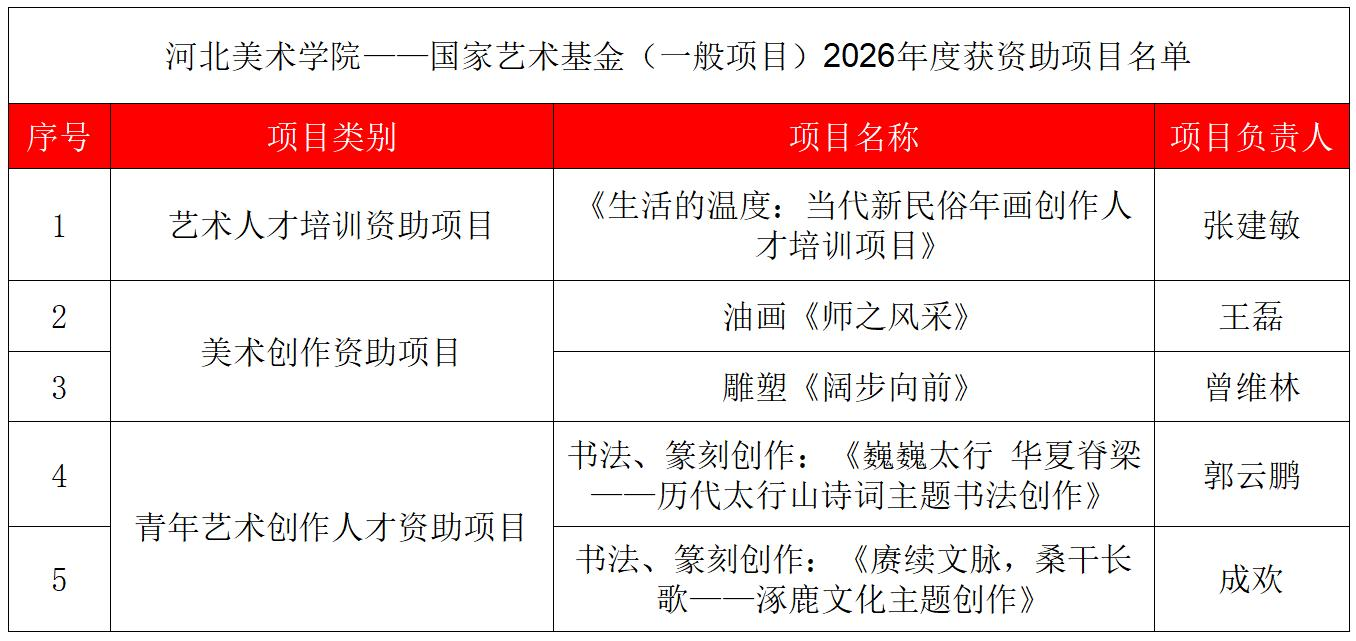 近日,国家艺术基金管理中心公布了国家艺术基金(一般项目)2026年度资助项目名单,立项资助项目共879项,综合立项率约为7.6%。河北省获批19项,best365官网立项5项,立项数量位居全省首位,涵盖艺术人才培训资助项目1项,美术创作资助项目2项,青年艺术创作人才资助项目2项。best365官网此次获批立项,根植于长期以来在艺术学科建设上的系统布局与精心培育。为精准提升项目申报质量,学校精准施策、...