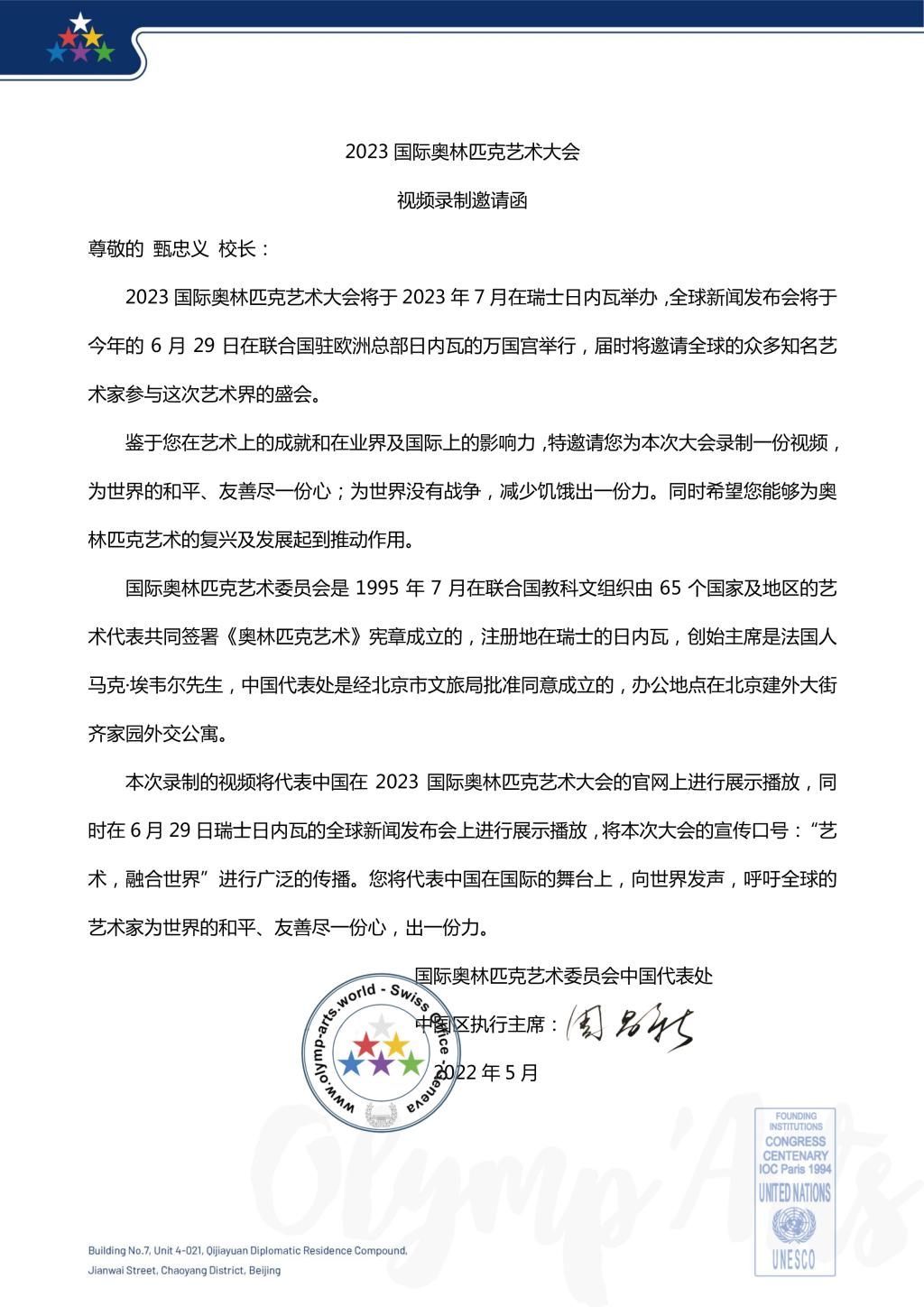 本次录制的视频将代表中国在国际奥林匹克艺术大会的官网上进行展示播放,同时在瑞士日内瓦的全球新闻发布会上进行展示播放。甄忠义校长将代表中国在国际的舞台上,向世界发声,呼吁全球的艺术家为世界的和平、友善尽一份心,为世界没有战争、减少饥饿出一份力。