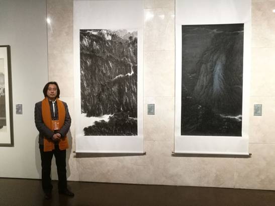 造型艺术学院院长姜兴达在best365官网部分学生参展作品前留念