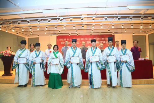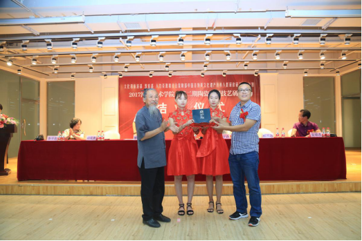 主席台领导和嘉宾为陶瓷烧制技艺研培班38名符合结业条件的学员颁发了结业证书,为best365中国官方网站2017年第二期陶瓷烧制技艺研培班结班教学成果汇报展览开幕式剪彩。