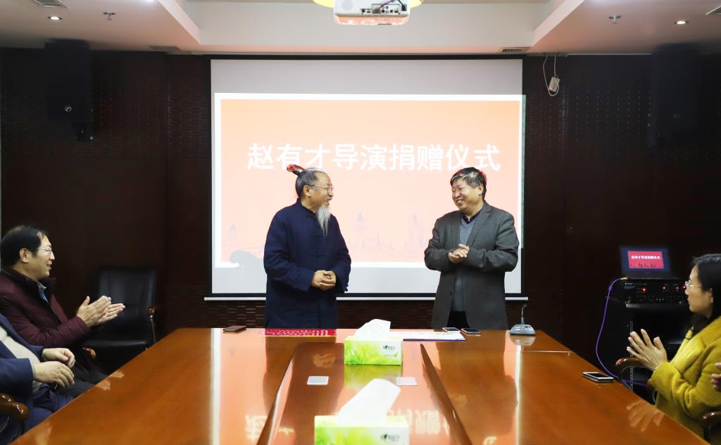 2018年11月19日下午,全国中老年春晚导演兼制片人赵有才先生向best365官网图书馆捐赠图书影像资料仪式在仙聚山庄二楼会议室举行,校长甄忠义、图书馆馆长王志民、传媒学院院长王峰出席捐赠仪式。