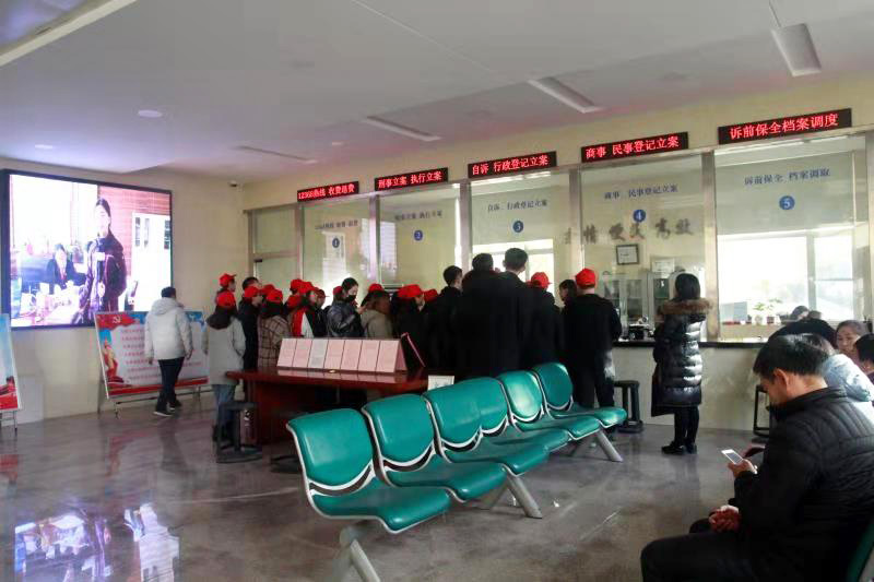 法院工作人员引领学生们先后参观了立案大厅和立案窗口,介绍了立案引导和电子立案及其查询程序,讲解立案材料的接受、审查和处理等立案程序。同时回答了师生们提出的立案标准、立案收费、行政案件、法律援助和公告送达等法律问题。