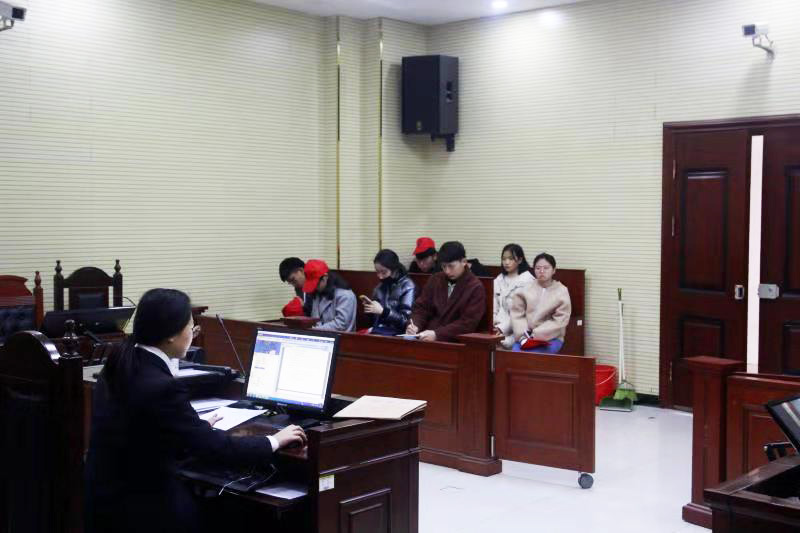 在法院工作人员引导下,学生们分两组在第四法庭和第五法庭旁听席就座,旁听两场民事经济合同纠纷案件的审理。亲身感受法官宣读法庭纪律和宣布开庭等环节,感受在审判员主持下,原告、被告以及其代理人,围绕合同构成及其证据,进行法庭调查、举证质证、法庭辩论和原被告最后陈述的过程,使同学们身临其境地了解案件法庭审理过程。