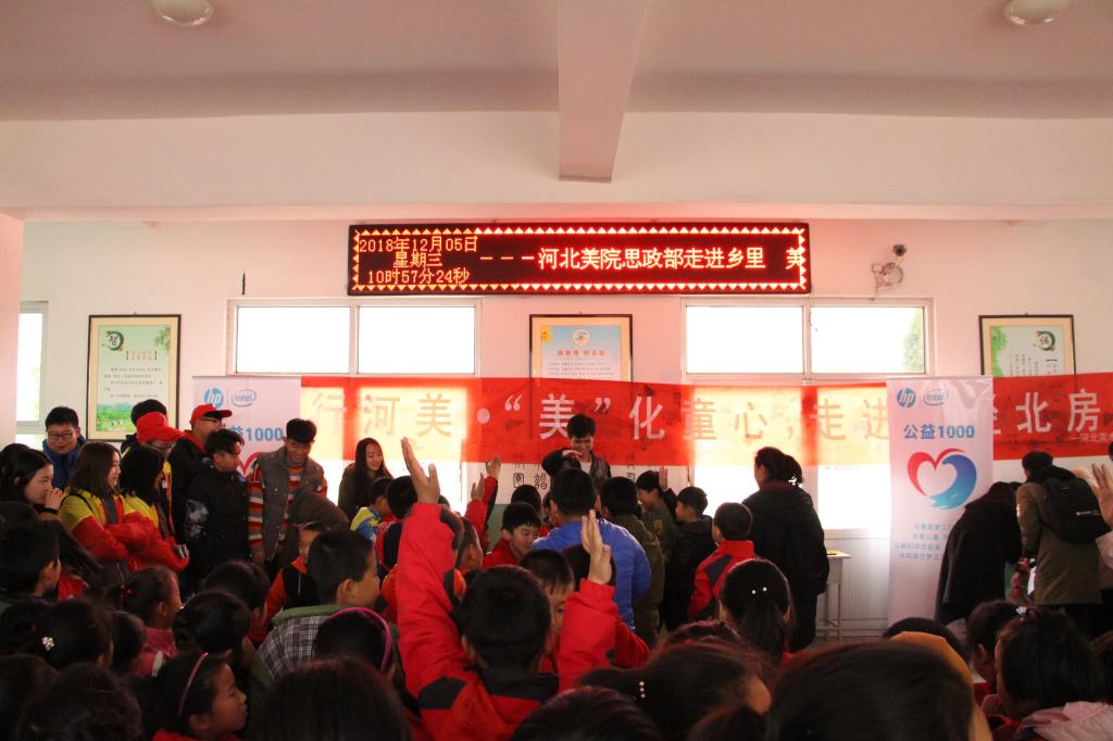 北防口村小学位于井陉县孙庄乡北部的大山脚下,是远离县乡比较边远的村级小学。河美师生早晨六点半集合出发,驱车近两个小时来到了北防口小学,受到小学师生热烈欢迎。