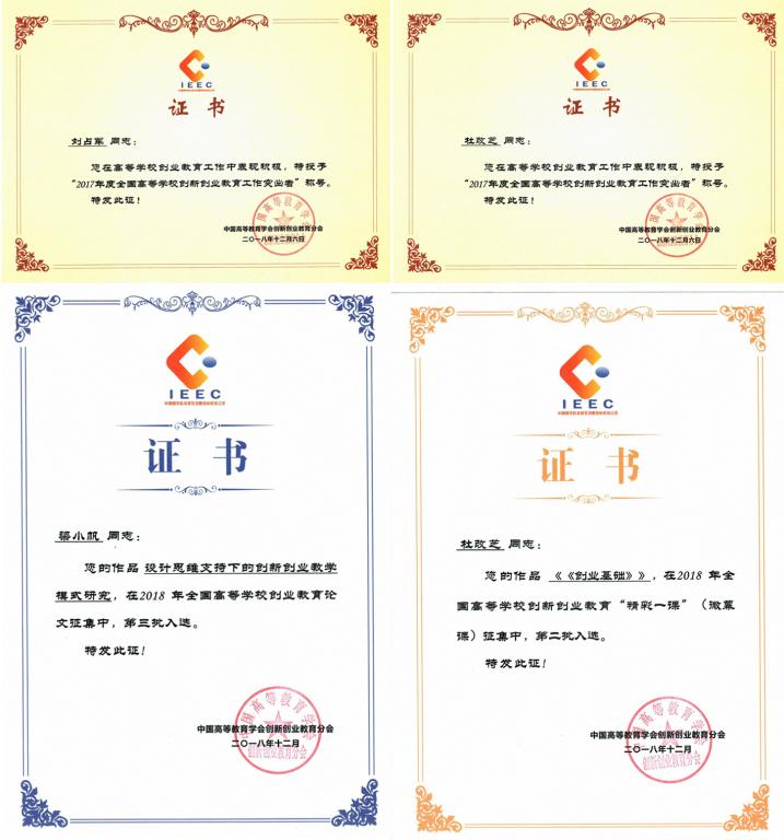 best365官网荣获“全国深化创新创业教育改革特色典型经验高校”称号,学校刘占军、杜改芝老师获得“全国高等学校创新创业教育工作突出者”称号;杜改芝老师的《创业基础》(微慕课)在2018年全国高等学校创新创业教育“精彩一课”第二批入选;梁小帆老师撰写的论文《设计思维下的创新创业教学模式研究》第三批入选。