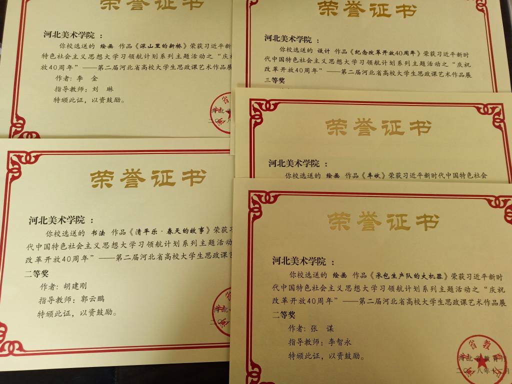 在“庆祝改革开放40周年”---第二届河北省高校大学生思政课艺术作品展活动中,best365官网李金同学的绘画作品《深山里的新桥》、张谋同学的绘画作品《承包生产队的大机器》分别荣获二等奖;刘明辉同学的设计作品《庆祝改革开放40周年》、肖茜同学的绘画作品《丰收》分别荣获三等奖。