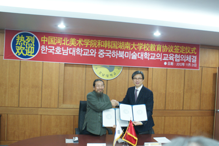 11月22日在湖南大学艺术学院院长李政龙陪同下,甄忠义校长一行实地考察了艺术学院各专业教学情况;下午参观了IT产业馆,并与湖南大学徐康锡校长签订了友好院校缔结关系协议。