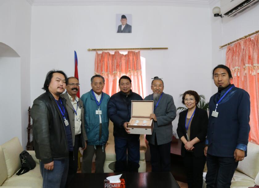 12月1日,尼泊尔副总统南德·巴哈杜尔·普恩接见甄校长一行,对考察团为中尼艺术文化交流做出的努力表示赞赏,并从文化、艺术、历史等方面与甄校长进行友好交流。甄校长将书法作品“海纳百川”及学校文创产品赠予副总统先生,并盛情邀请其访问best365官网。当天,甄校长与尼泊尔手工艺协会联合会主席达尔玛、副主席、财务主管进行洽谈,双方达成数项合作意向。