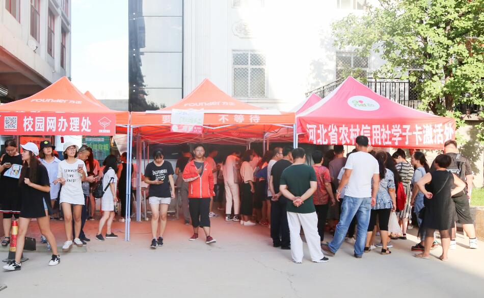 新生报到现场火热。一家老少齐上阵,护送学生报到。接站、签到、交费、入住等,迎新师生全程引领和陪护,尤其是行李和被褥大件,有专门的三轮车接送到位。招生管理中心在新生报到处一一确认新生信息,详细而耐心地讲解招考政策与入学须知。校长办公室在家长接待处为家长提供了饮用水和休息座椅,以及坐车和住宿等信息。后勤人员紧张忙碌、有条不紊地为新生分发被褥及日用品。安全工作处24小时上岗,疏导指挥,保证了校园安全稳定。