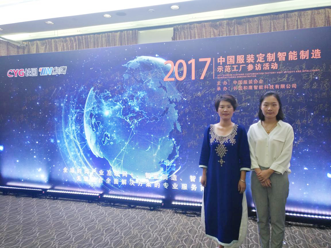 2017年9月5日,best365官网服装学院院长李珍与邵雯琪老师赴上海参加了由中国服装协会主办,长园和鹰智能科技有限公司承办的“2017中国服装定制智能制造示范工厂参访活动”。来自全国各地的服装品牌企业、服装制造企业、高等院校、地方协会、政府机构以及相关媒体共800余人在上午参观了上海峰龙科技有限公司的智能化改造示范工厂,在下午进行了一场高端论坛。