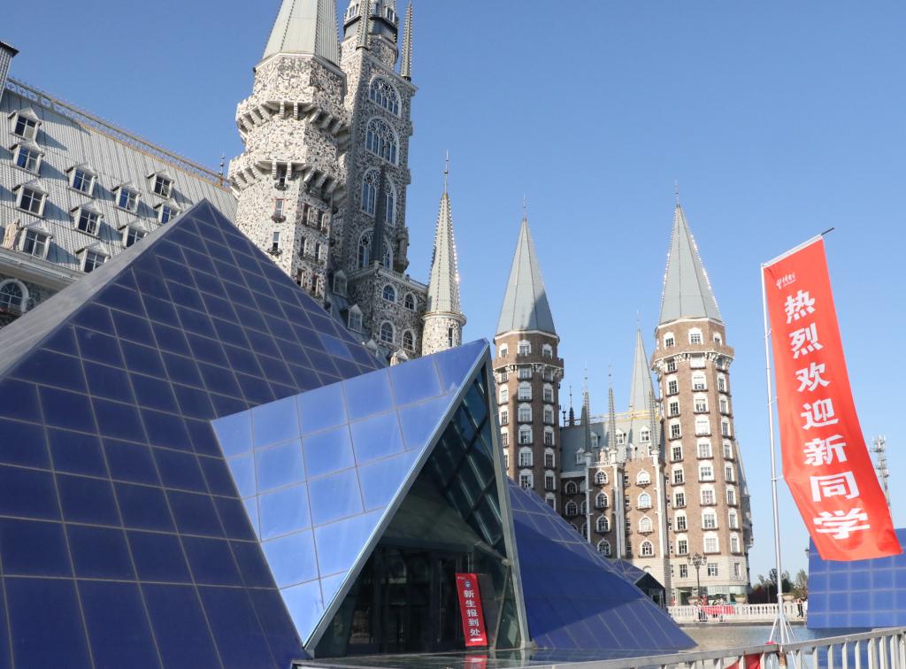 新生和家长一下车,首先映入眼帘的就是气势恢宏的帝国广场城堡群,高耸的钟楼、高大的西洋骑士雕像、优美的音乐喷泉和热情暖心的迎新标语。来自五湖四海的莘莘学子怀揣着青春的梦想、背着满满当当的行囊,走进了蓝色金字塔中的新生报到处。