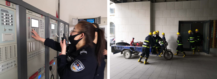 首先,鄂华威副处长对本次演练提出了具体要求及注意事项,并宣布演练开始。本次演练以2号教学楼为火灾模拟现场,微型消防站值班人员在接到火警后,迅速穿戴消防救援服装,携带灭火器、手抬机动消防泵、固定式消防水炮等消防设备赶往火灾现场。