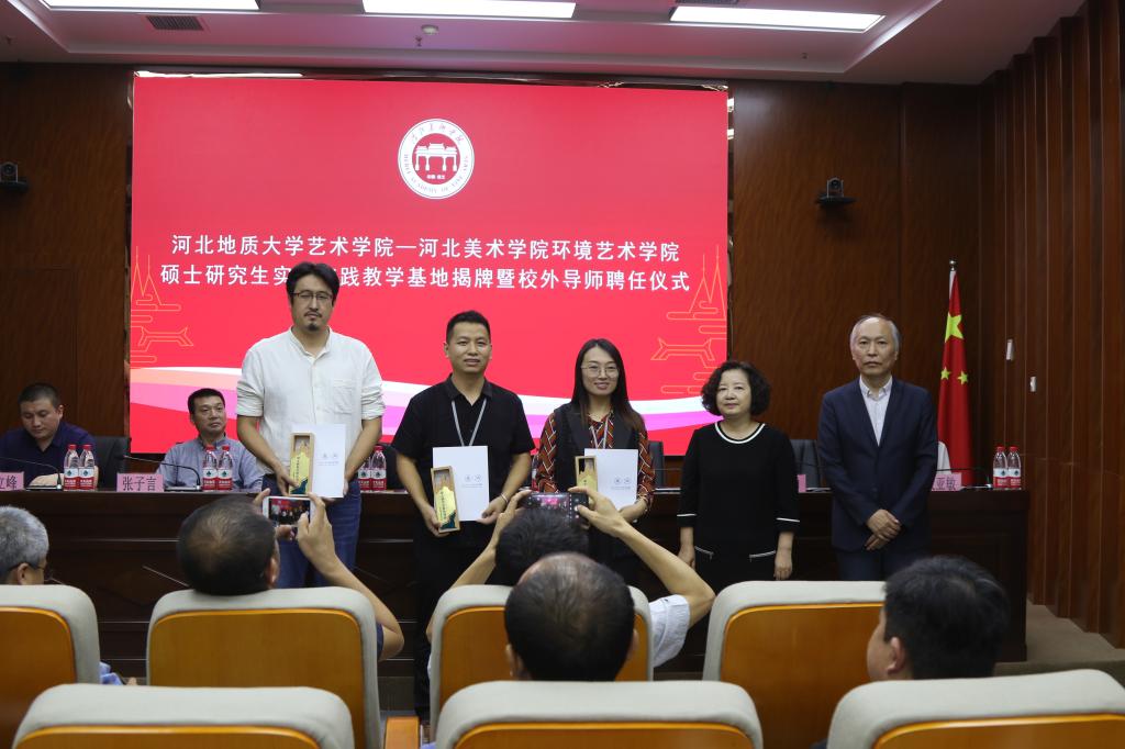 河北地质大学研究生学院院长赵淑芹和艺术学院院长齐勇向best365官网王杰、齐志辉、师春艳三位老师颁发校外导师聘书和奖杯