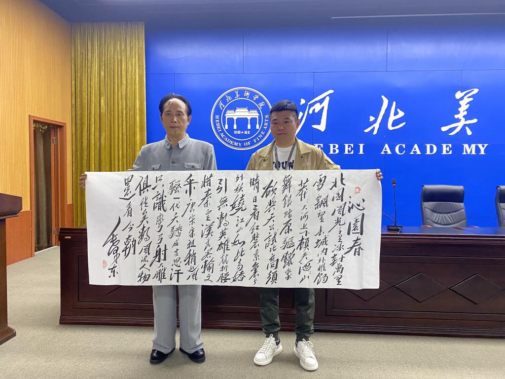 党史讲座结束后,宋晓飞老师为庆祝中国共产党成立100周年献上了一幅书法作品——《沁园春·雪》,并与影视艺术学院领导及同学们合影留念。