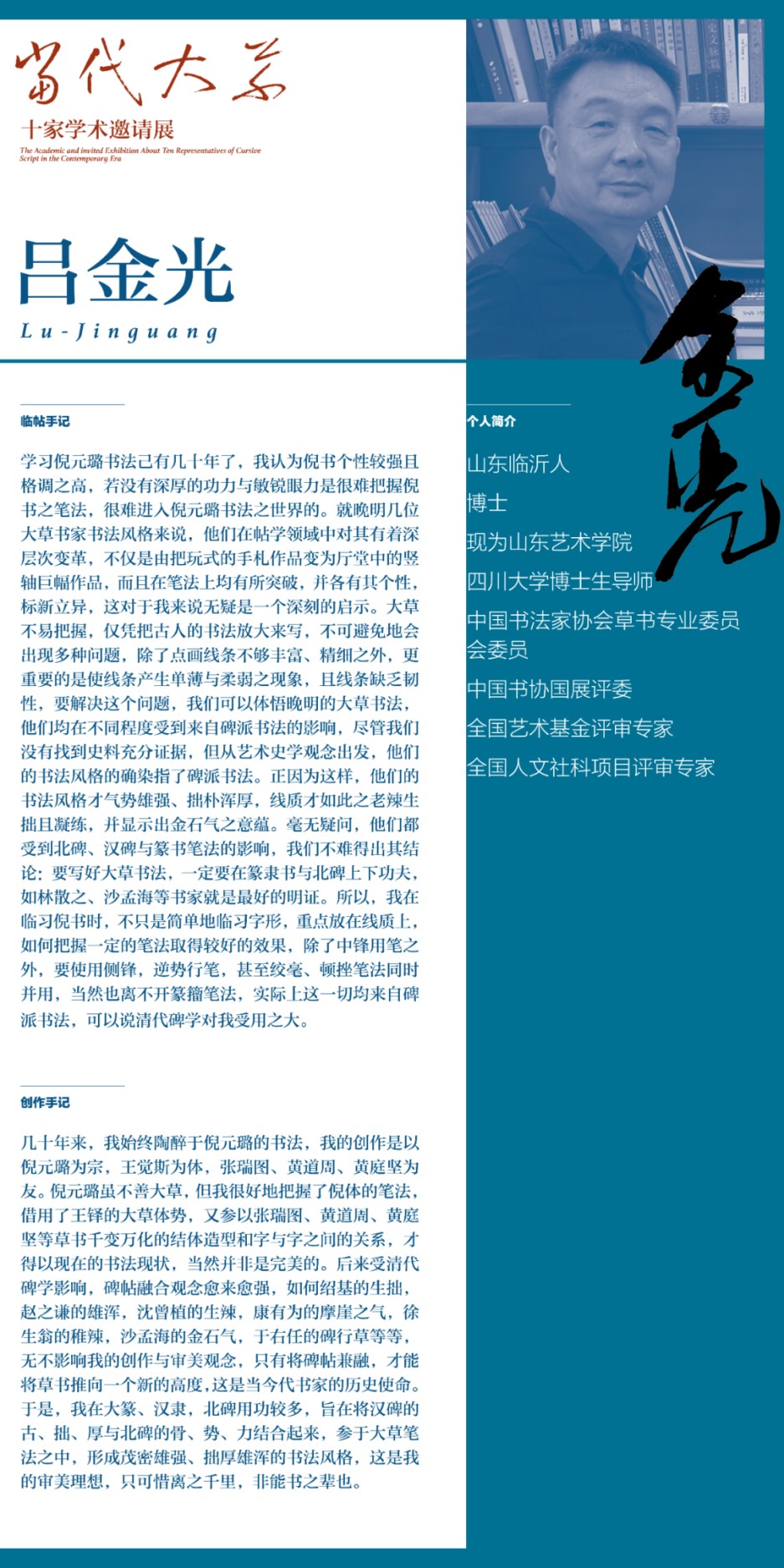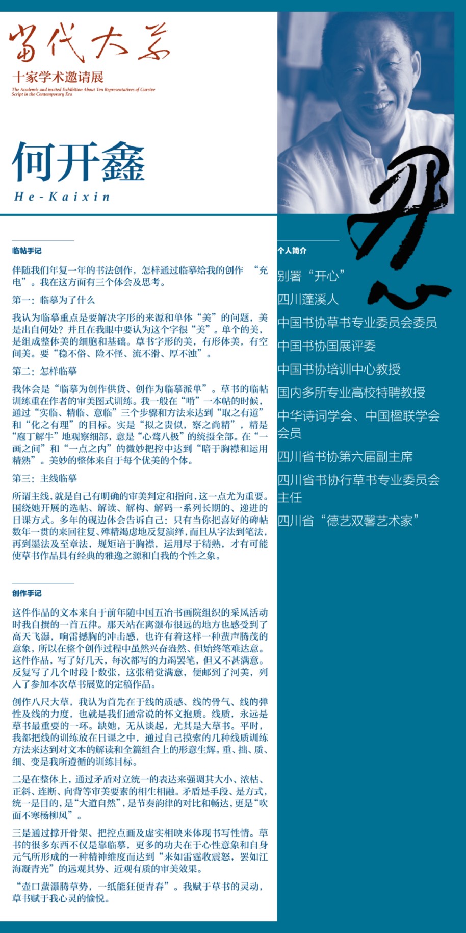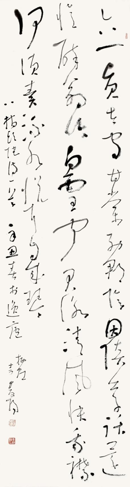 考虑到当代书法于古典传统的恢复只有短短的四十余年,它的再生还带着很多不确定性,并且几乎是在一个时代的剖面上,而要承受来自传统,近现代与西方现代性三个方面的冲击并需作出应激反应,如此一来,我们对当代书法便不得不抱有某种宽容与同情。 也几乎在同时,当代书法便被命定地抛入一个危机性境遇,而不得不承受某种天命,它既不能不加改变地与传统共存,也不能游离于经典传统之外任意而为。而要建立时代性权威,则几乎无法在经典传统与时代风格创造之外去寻找。“更进一步的问题,在何种程度上,古老的视觉产生被引入新的艺术风格阶段。一种永久的艺术发展是如何和一段特殊的艺术发展相混合的。这些问题都只能结合具体情况进行分析。”(沃尔夫林《艺术史的基本原理》)这一点可能是尤为重要的。站在中西碰撞的现代境遇来审视本土古老传统书法,很容易产生一种激进情绪和变革冲动。现代性以一种天然的合法性给艺术家以鼓动,而走向变革与冒险。由此,当我们对现代性处于被动接受之际,它对本土文化艺术的冲击与伤害便势在难免。不得不承认,我们当下仍处于一种被支配的现代性惯性之中。在这种现代性观念支配下,很难冷静理性地思考书法经典传统与本土文化命运问题。书法也不例外。很多情形下,我们往往将传统作为现代的对立面,因而对传统与现代缺乏主体间性的思考,而尤为强调了两者之间的对立冲突。由此书法便成为单面的存在。而更为致命的是,在对现代性偏面的理解下,形式冲动代替精神本体成为现代性的标志。书法由此丧失了精神本源与历史文化向度。 瞻顾书史,古老书法传统是这样一种产物:它由内容(文化)积淀为形式,而不是单纯的形式化。草书尤其如此。它将书法线条抽象化到极致而贯通形上哲学。“一条线通贯着大宇宙。”(罗丹语)因而宗白华说:“中国书法的线不是西方几何的线,而是一阴一阳之谓道,宇宙自然的气韵变化。是道舞空白的大化流行。”从这一点之笔流出万象之美。开始于一画,既流出人心之美,也流出万象之美。”(《美学散步》) 中国草书的线条,更是体现出阴阳往复翕辟,气韵生动即生命的节律。而张彦远在《历代名画记》中所称“气脉通连,隔行不断”即指“一笔书”阴阳通贯,无不往复。天地之际的绵延之维与生命之道。也表明狂草的最高精神与宇宙自然相融合。 “当代大草十家学术邀请展”,应该说不是一个一般意义的应酬性展览,而是带有批评的立场与目的。它与“晋唐一体—— 全国草书史学术论坛”同时举办便明确表明了这一点,进而也增强了它的学术性与史学性。草书发展到当代,已提示出将草书置于书史语境与“问题丛”中加以审视批评的重要性。质言之,当代草书已进入到需要历史化的进程之中。长达两个世纪的碑学对帖学的统辖已经终结,晚清民初以来持续产生创作效应的碑帖融合一路也已趋于式微。帖学已然独立并推动帖学获得复兴与拓化,这为当代草书创作带来先机。只是当代草书家准备好了吗?这种现实的发问无疑还是必要的。“我们需要多角度的观点和不同看法”。这至少需要从草书史的立场来认识与厘清草书史的周期性与连续性及草书史高峰的标立;其中最重要的则是草书史风格的衔接与嬗变及价值确立。“既使是最卓越的天才也不可能超越一些设定好的限制或超越它的时代,并不是总是一切皆有可能。特定的思想也只能在某个发展进程中才会产生。”(沃尔夫林《艺术史的基本原理》) “当代大草十家学术邀请展”无疑集聚了从20世纪50年代横跨80年代四个年龄段的当代优秀的草书家。十位书家在草书创作领域有着无可争议的代表性。他们的草书创作风格各异,对草书的取法阐释有别,但其共同点则表现在皆以其个性化的草书创作表达了他们的草书审美理想。他们的草书体现出草书经典传脉的当代表达,是草书发生价值转换的重要界面与一环,通过他们的草书创作甚至可以对当代草书存在状态作出一定价值判断,从而体现出他们草书创作的当代张力。但正如当代书法经过四十年发展,又归结到一个新的节点与转捩一样。他们的草书创作也面临着一个节点,即是满足或停留于个性意志的创作,还是选择有难度的艺术史进步意义的书法创作。对于草书家而言,选择了草书就等于选择了书法史意义上的挑战,这种创作选择本身就包含着历史与现实、风格与精神的双重结构,同时还寄寓着思言道的定在。正如方闻在《心印》“伟大的传统”导言中所说:中国的文学、书法和绘画,不但有一个完整而连续的历史,而且这历史还与一个强大的道德精神传统—— 一种有精神目的却又充满自由多样行为的意识是共同发展的。注重道统,不具备对文化传统中道的认识,任何独特的或者怪异的思想,不管有多么奇警,只能导致妄作,不能载入新的史册。对更新传统原理轮回的信赖导致了种种人在实践上模仿古代典型的心理。以后历代成功的更新无不有赖于恰如其分地复兴古代的风格(《心印》)。 由此,在本土传统文化包括书法整体复兴的主潮中,反思西方现代性和固守本土文化价值—— 穿越西方回到中国,是一个重要课题。中国传统书法与古典文化传统相似,皆是思言道的统一,而不是西方形式化的单维扩张,认识把握到这一点无疑是至关重要的,它表明中国书法