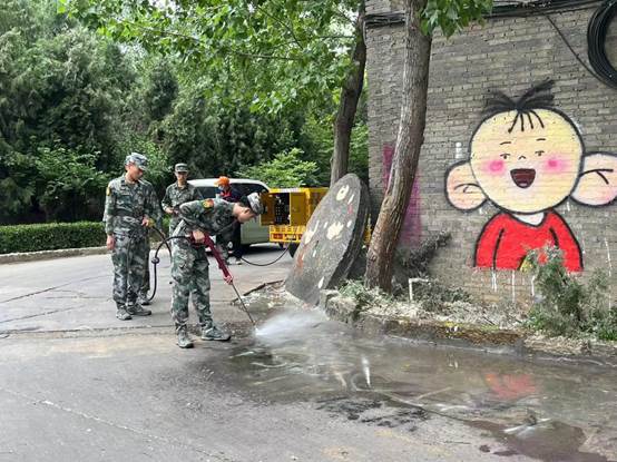 国防直属团的同学们积极响应号召,以饱满的热情投入到九道湾卫生打扫中他们拿着垃圾袋、刷子、高压水枪来清理地面上的涂鸦。