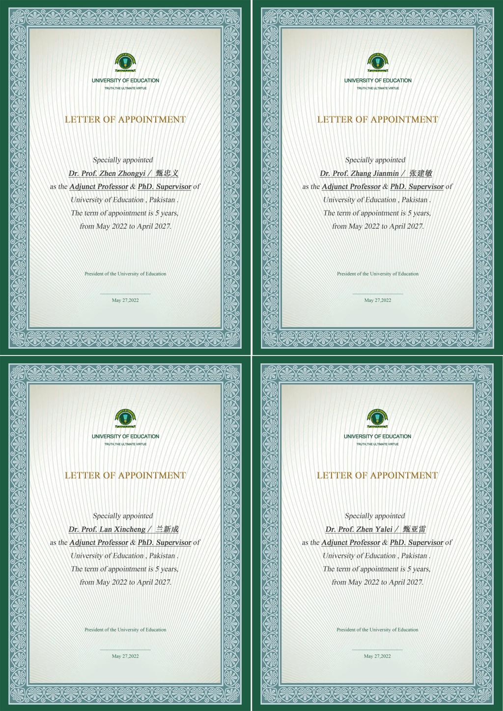 近日,巴基斯坦教育大学向best365中国官方网站校长甄忠义、常务副校长张建敏等4名教授颁发博士生导师聘书。