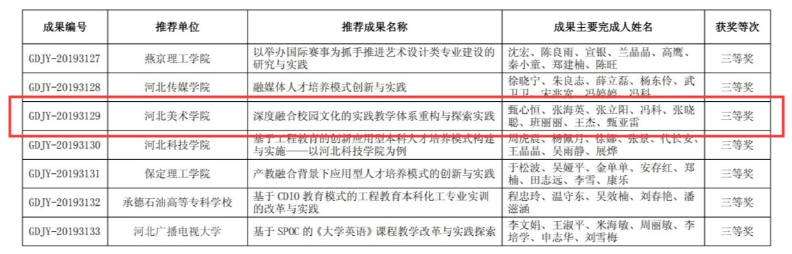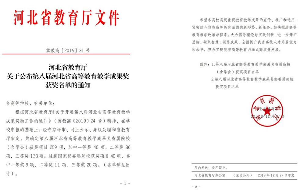 河北省高等教育教学成果奖授予在高等教育教学工作中做出突出贡献,取得显著成果的集体和个人。成果集中体现在创新人才培养模式、重构课程结构及教学内容、改革教学管理、创新教育教学方法、促进科研及教学互动、强化实践育人环节、改革考试方法等方面。由甄心恒副校长主持的《深度融合校园文化的实践教学体系重构与探索实践》荣获第八届河北省教育教学成果奖三等奖。