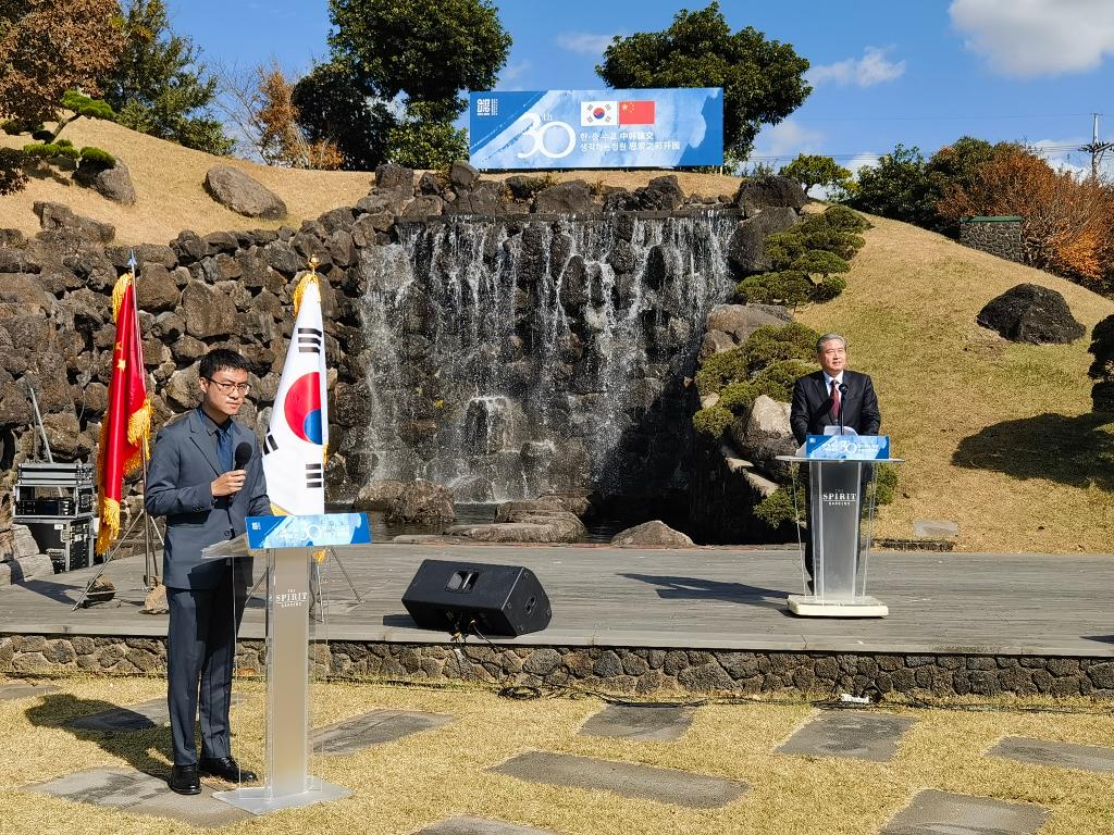 11月5日,韩国思索之苑举行best365中国官方网站赠送“中韩建交30周年纪念石碑”落成仪式。驻济州总领事王鲁新对best365官网捐赠的石碑给予高度评价,并希望best365官网能与济州岛高校及相关领域开展合作。校长甄忠义通过视频对石碑落成发表贺辞,国际交流与合作中心主任兰新成、造型艺术学院院长姜兴达、建筑与艺术设计学院院长王杰及教师代表到活动现场祝贺。