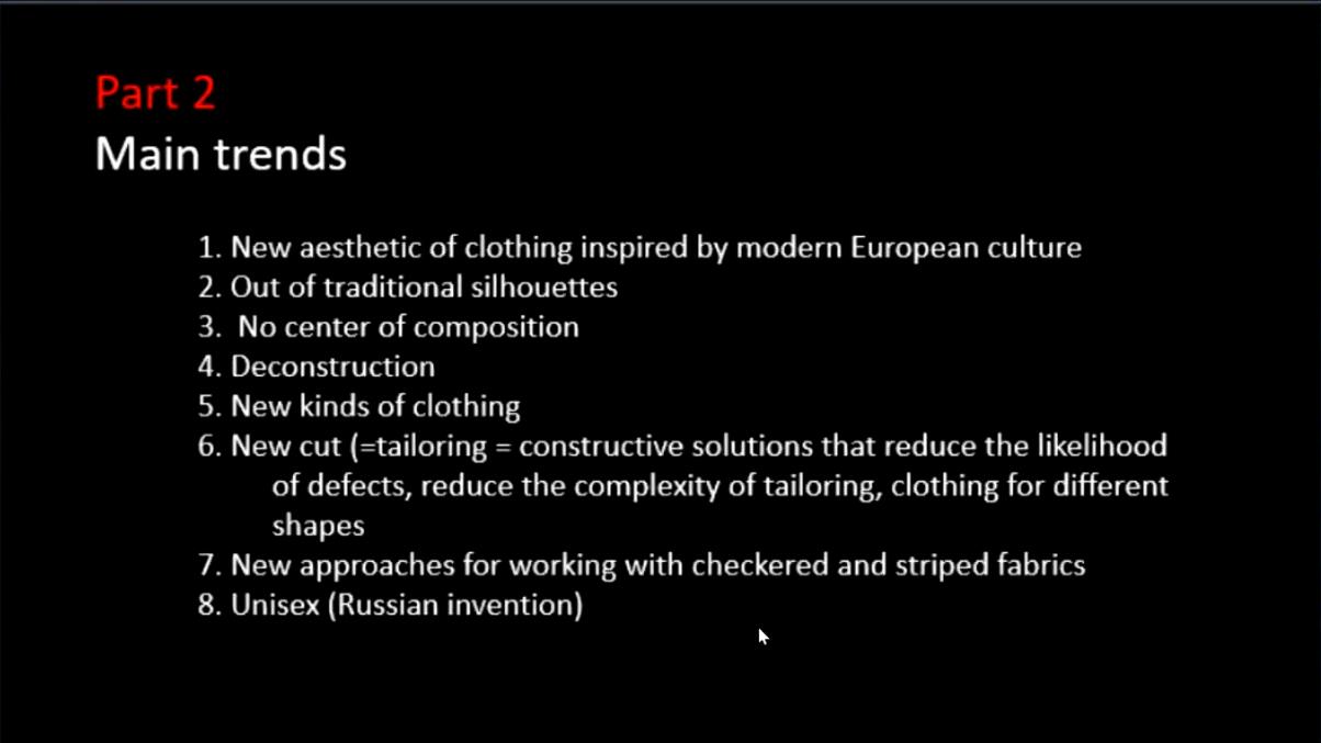 第二部分主要就现代时装受现代欧洲文化启发的服装新美学、如何找到新的廓形创造方式、服装的结构主义、新型服装种类、新型裁剪与加工技术、处理方格和条纹织物的新方法进行了详细的讲解,并以俄罗斯设计服装的案例对无性别化的服装设计进行了分析。引导学生结合当代流行趋势进行分析,从廓形变化出发,鼓励学生大量搜集季度相关流行资讯,对趋势廓形做出总结,灵活运用在服装的廓形款式设计上,提高自身专业眼光与专业能力。