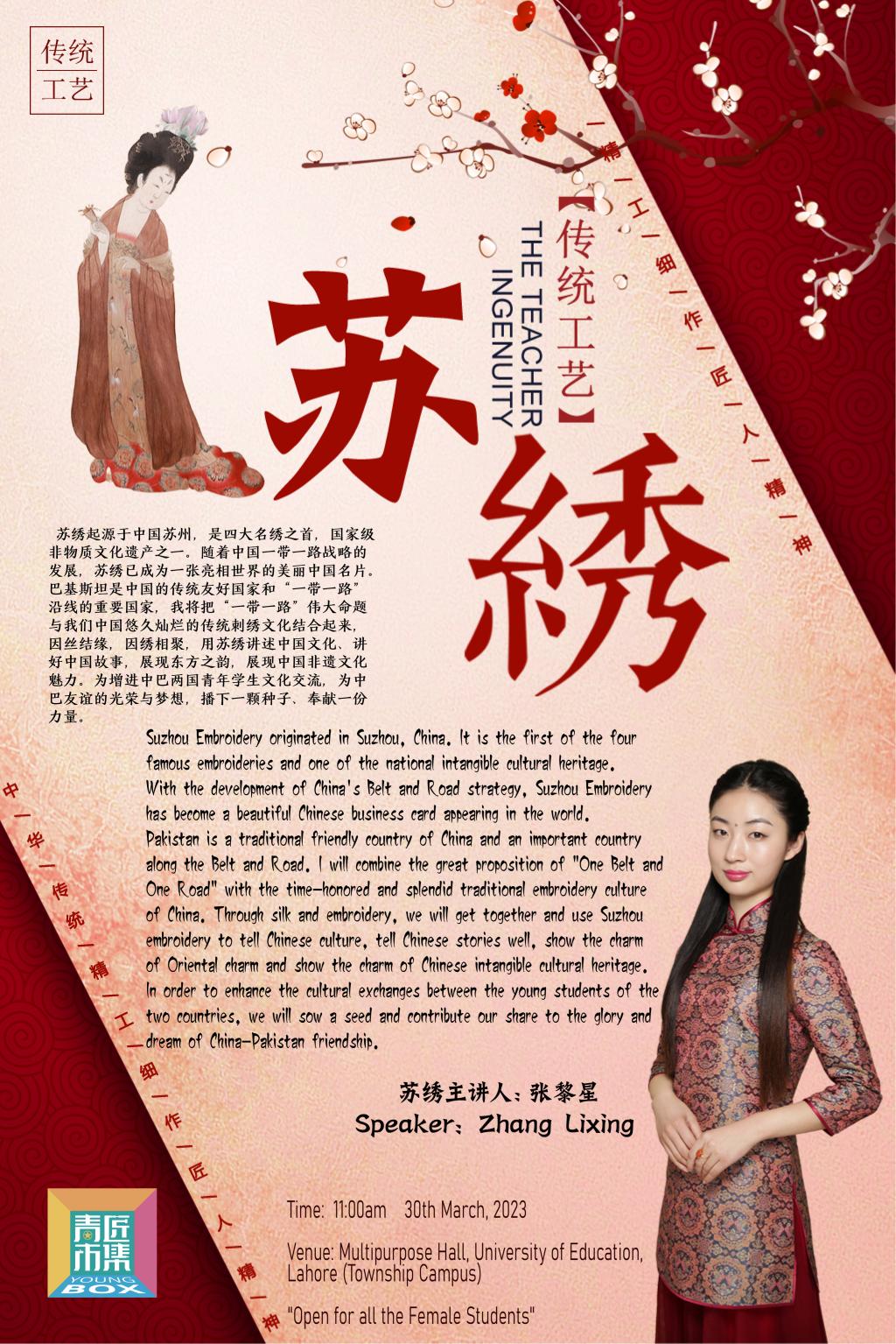 3月30日上午,中巴项目博士在读学生张黎星作为主讲人在巴基斯坦拉合尔教育大学多功能厅讲解苏绣文化,并带领与会人员现场体验了苏绣制作。
