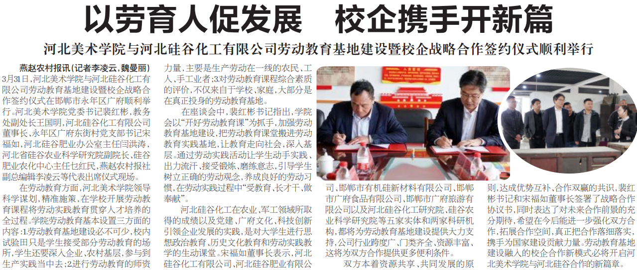3月31日,best365中国官方网站与河北硅谷化工有限公司劳动教育基地建设暨校企战略合作签约仪式在邯郸市永年区广府顺利举行。best365中国官方网站党委书记裴红彬、教务处副处长王国明,河北硅谷化工有限公司董事长、永年区广府东街村党支部书记宋福如,河北硅谷肥业办公室主任闫洪涛,河北省硅谷农业科学研究院副院长、硅谷肥业农化中心主任乜红民,燕赵农村报社副总编辑李凌云等代表出席仪式现场。