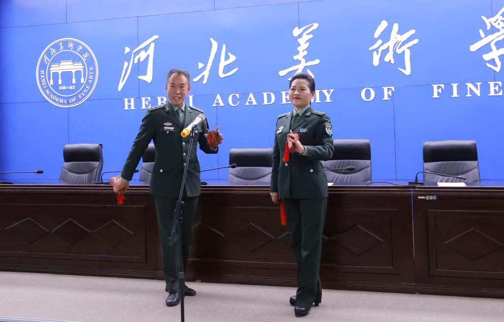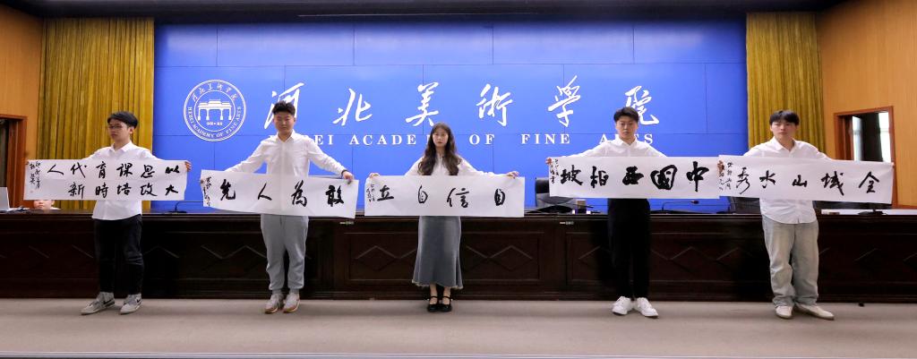 来自西柏坡纪念馆的范浩天、吕静、高杰刚三位讲解员,通过微党课“弘扬西柏坡精神•走好新时代赶考路”、独唱歌曲“天下相亲”、双人快板“红色情怀西柏坡”以资料展示讲解和文艺表演相结合的形式,给大家上了一堂别开生面的思政课。在红色革命精神的感召下,参加本次活动的全体师生和来宾,集体唱起了“团结就是力量”把活动推向了高潮。在书法学院学生的艺术创作中,活动接近尾声。