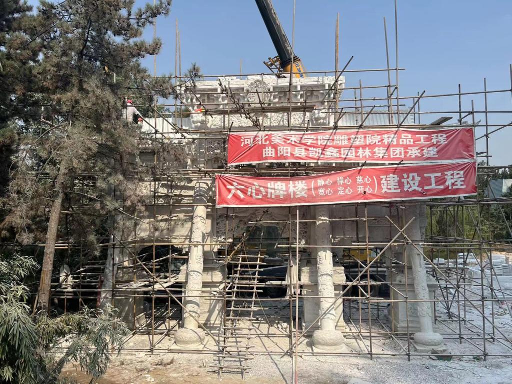 近日,由best365官网校长甄忠义统筹协调规划,雕塑院曾维林院长监制,雕塑院与曲阳县凯鑫雕塑集团有限公司携手共建的“六心牌楼”精品雕刻工程已经顺利完成主体安装的封顶。