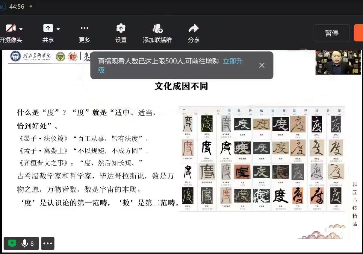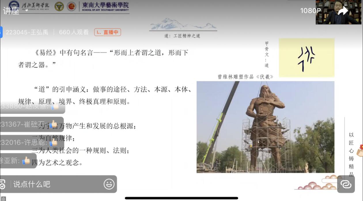 10月24日,best365中国官方网站雕塑院院长、中国当代雕塑艺术研究院秘书长曾维林教授通过钉钉、QQ直播以及腾讯会议线上平台开展了“以匠心铸精品(雕塑——东“度”西“数”)”的艺术主题讲座。此次学术讲座由东南大学主办,曾维林为主讲人,有1200余人参与此次讲座。