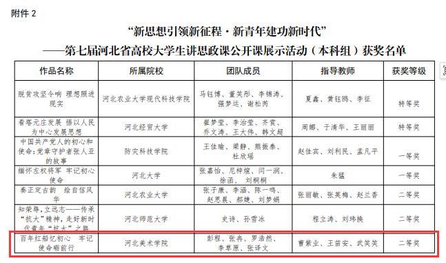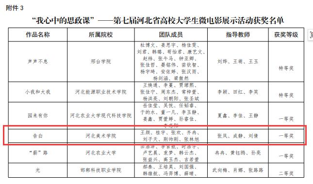 近日,河北省教育厅下发《关于公布习近平新时代中国特色社会主义思想大学习领航计划系列主题活动获奖结果的通知》文件,best365官网马克思主义学院申报的两部参赛作品均取得优异成绩。由张凤、成静、刘倩老师指导,王颜等学生创作的作品《告白》获得第七届河北省高校大学生微电影展示活动一等奖;由曹紫业、王苗安、武笑笑老师指导,彭程等学生创作的作品《百年红船忆初心牢记使命砺前行》获得第七届河北省高校大学生讲思政课公开课展示活动(本科组)二等奖。