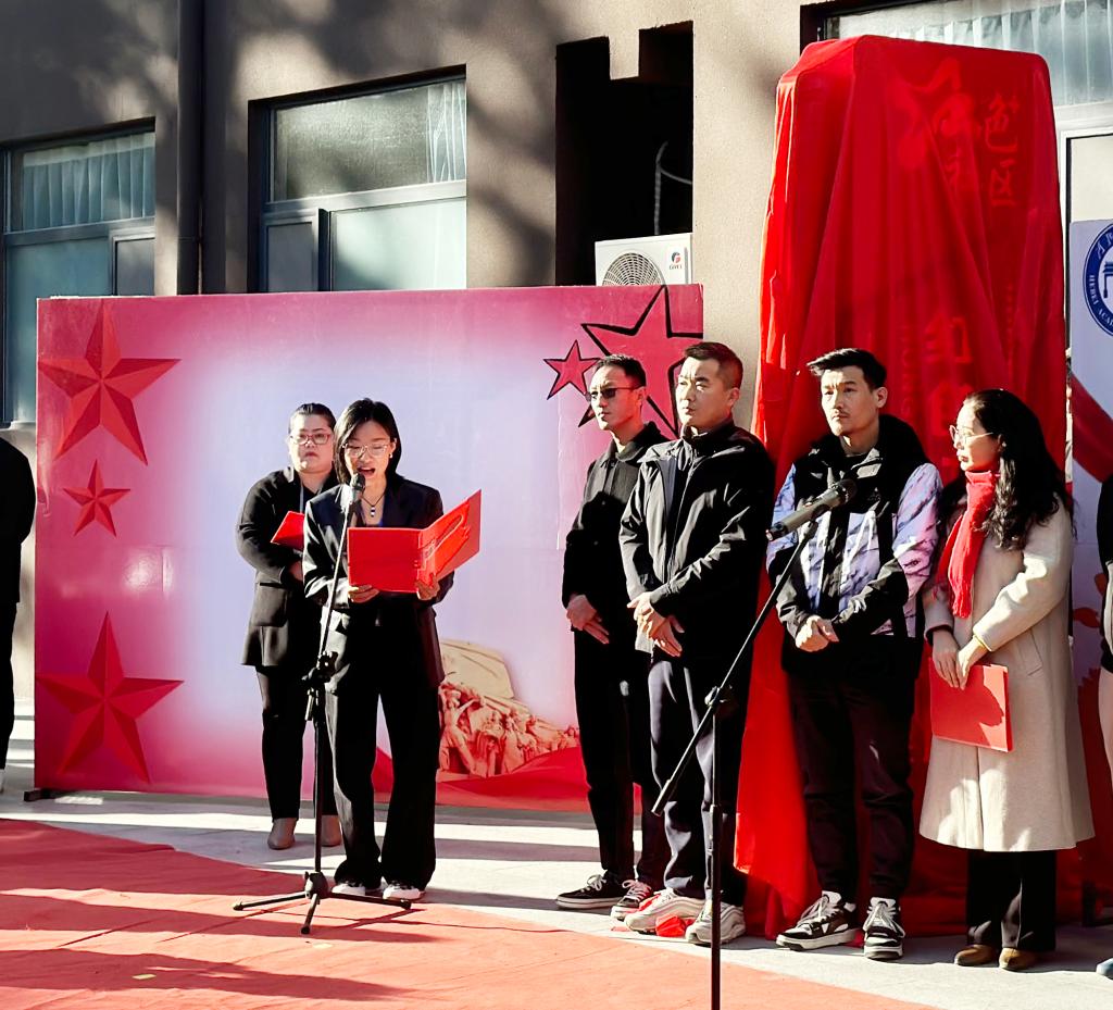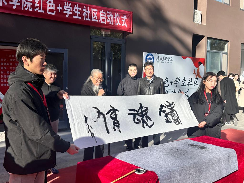 校长甄忠义亲自为社区题字“铸魂育人”。与会领导为社区揭牌。
