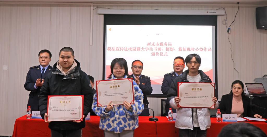 12月4日,税法宣传进校园暨大学生书画、摄影、篆刻税收公益作品颁奖活动在书法学院3号教学楼举办。此次活动旨在增强大学生对税法的了解和认识,提高他们的法律素养。活动由新乐市税务局和书法学院主办。