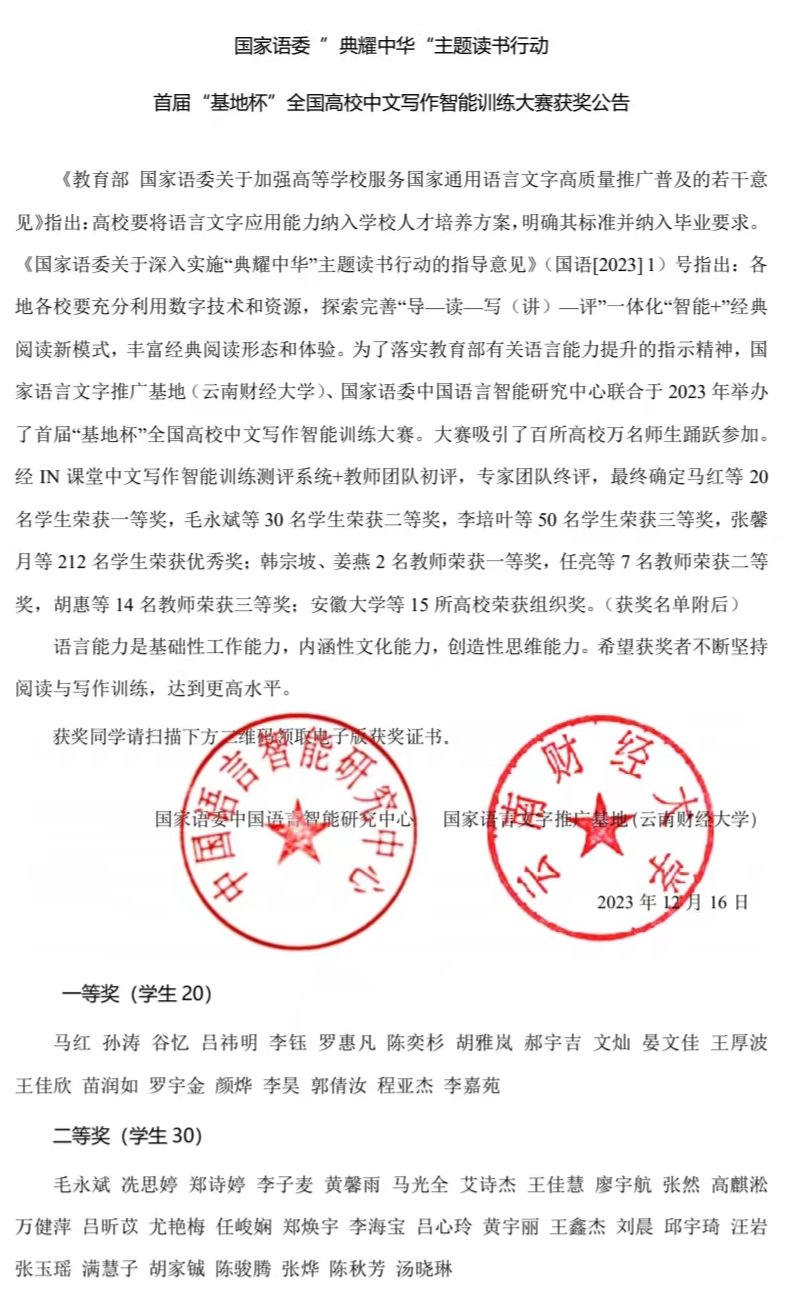 12月16-17日,第四届中国智能教育大会暨第六届中国语言智能大会在四季如春、景美情深的云南春城召开。会上,国家语委 “典耀中华”主题读书行动·首届“基地杯”全国高校中文写作智能训练大赛举行颁奖仪式。本次大赛颁奖典礼best365官网共有学生组一等奖1名,二等奖1名,三等奖2名,优秀奖15人。