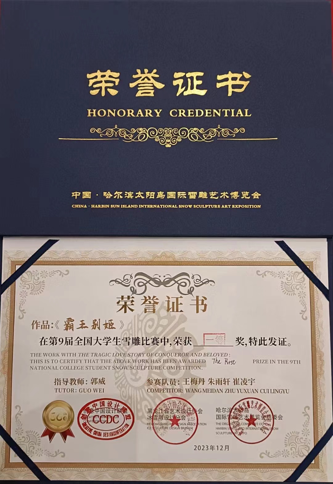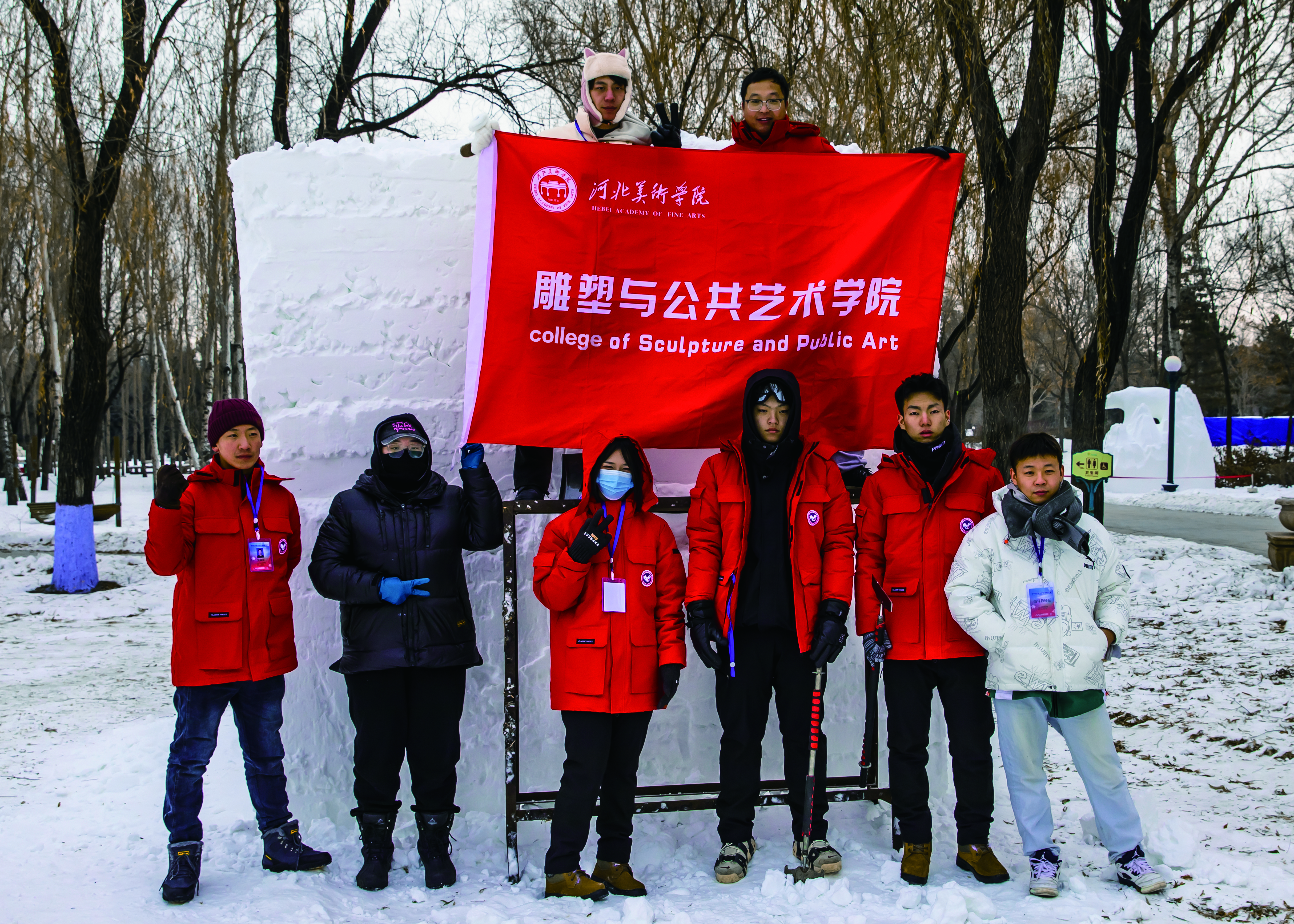 12月19日,第九届全国大学生雪雕大赛在哈尔滨太阳岛雪博会落幕,best365中国官方网站学生斩获殊荣,满载而归。雕塑与公共艺术学院共派出两支队伍参加此次比赛。教师郭威指导学生王梅丹、朱宇轩、崔凌宇的作品《霸王别姬》荣膺桂冠;教师牛玮春指导学生马梓润、潘承宇、牟彦菲的作品《骇浪与鲨》获得优秀奖。