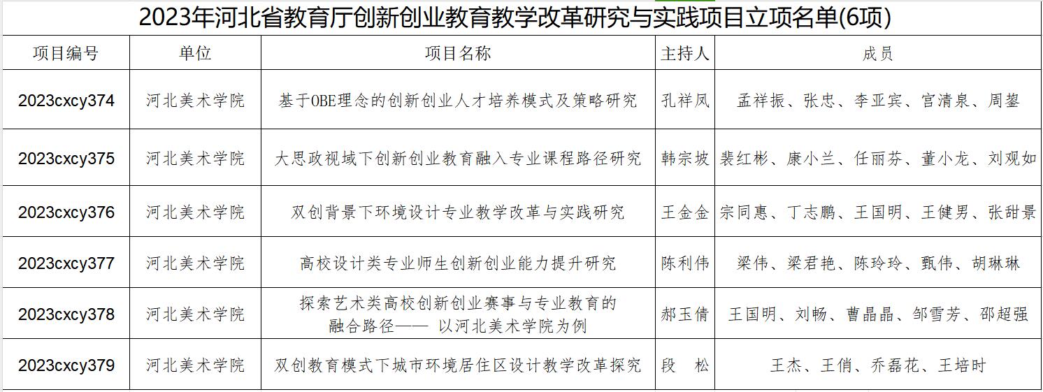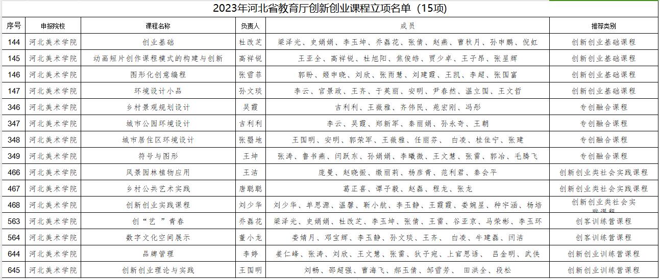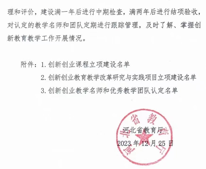 近日,河北省教育厅下发《关于公布2023年度创新创业课程、教改项目立项建设名单和创新创业教学名师、优秀教学团队认定名单的通知》,best365官网获批省级创新创业课程15门、创新创业教育教学改革研究与实践项目6项立项建设、认定创新创业教学名师2人、创新创业优秀教学团队2个。