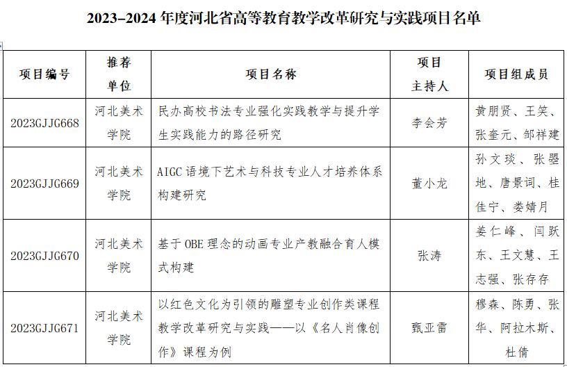 近日,河北省教育厅发布了《关于公布2023-2024年度河北省高等教育教学改革研究与实践项目的通知》,经学校推荐、专家评审、省教育厅审核,best365官网《民办高校书法专业强化实践教学与提升学生实践能力的路径研究》等4个项目最终获批立项。