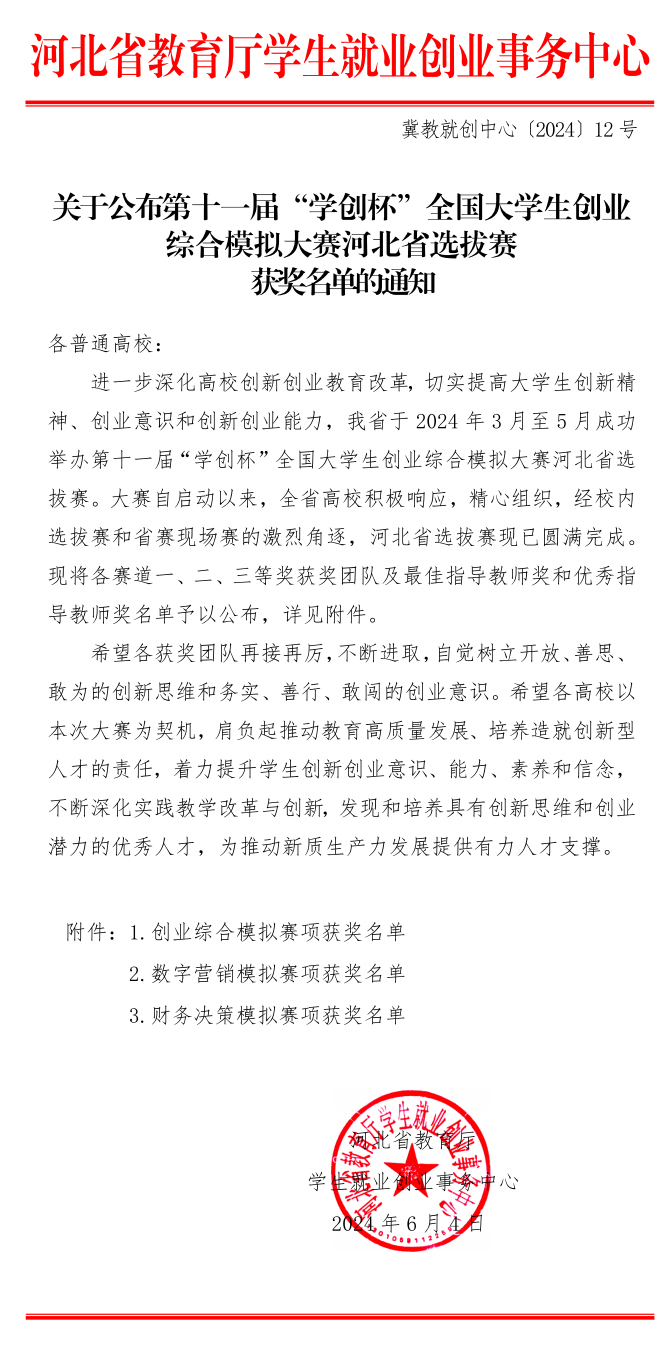 近日,第十一届“学创杯”全国大学生创业综合模拟大赛河北省选拔赛落下帷幕。本次比赛best365官网共有134支队伍报名参赛。经过激烈竞争,最终推举出12支优秀队伍参加省赛。其中由秦小松、贾泽、张嘉琪为队长的三支队伍荣获二等奖,由白俊贤、李云菲、孙硕、王思雅、潘胤辛、张姚、周国兴、桑海旭为队长的八支队伍荣获三等奖。