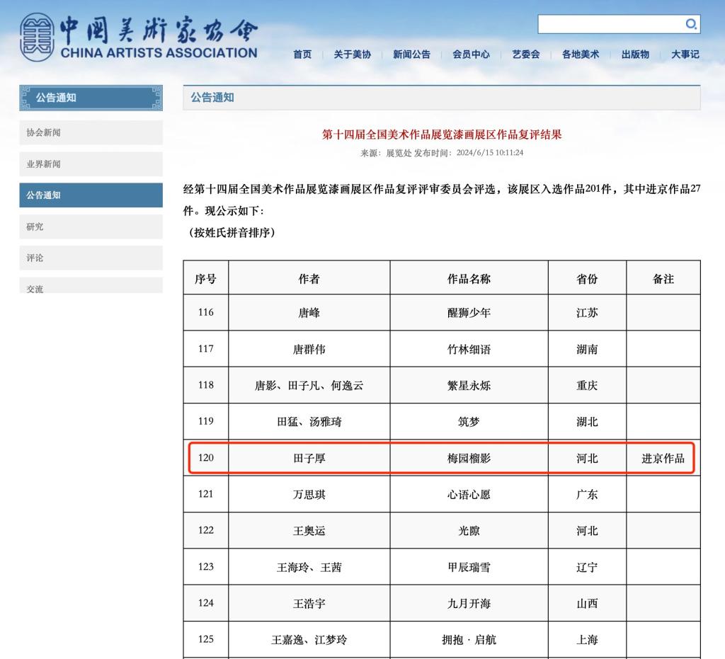 6月15日,经第十四届全国美术作品展览漆画展区作品复评评审委员会评选,该展区入选作品201件,其中进京作品27件。best365官网教师田子厚的漆画作品《梅园榴影》入选本次展览并获“进京作品”展资格。