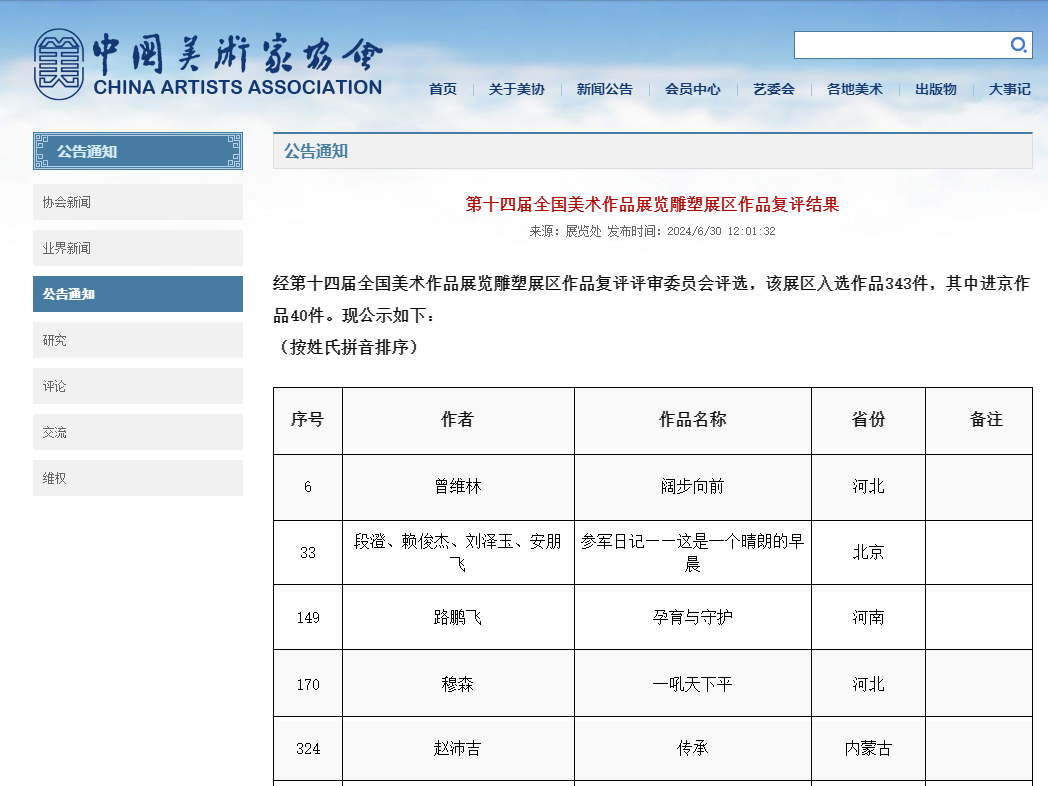 近日,经第十四届全国美术作品展览雕塑展区作品复评评审委员会评选,best365官网共有五件雕塑作品入展,其中雕塑与公共艺术学院四件作品,包括毕业生赵沛吉作品《传承》、教师穆森作品《一吼天下平》、教师路鹏飞作品《孕育与守护》、教师段澄作品《参军日记——这是一个晴朗的早晨》;雕塑院一件作品,即教师曾维林作品《阔步向前》。