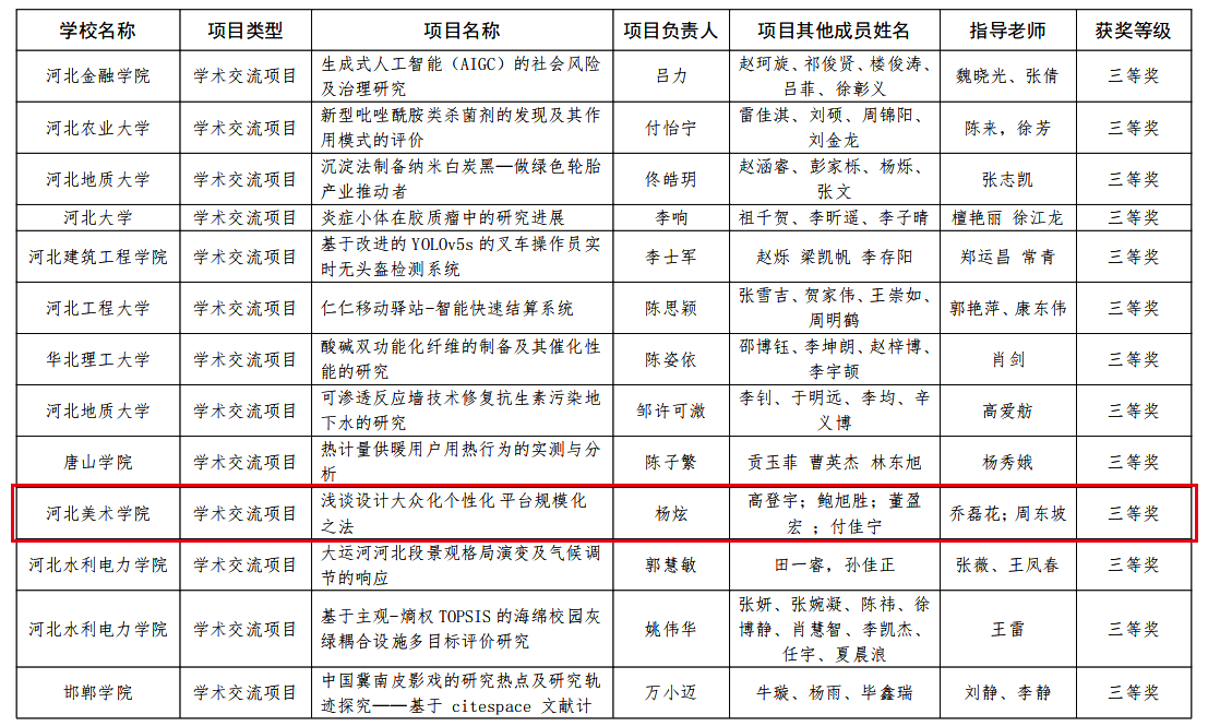 近日,河北省教育厅公布第九届河北省大学生创新年会获奖名单。由best365官网设计学院2019级学生杨炫主持的学术交流项目《浅谈设计大众化个性化平台规模化之法》(指导教师乔磊花、周东坡)喜获省级三等奖。本次获奖是best365官网在该赛事中取得的新突破。