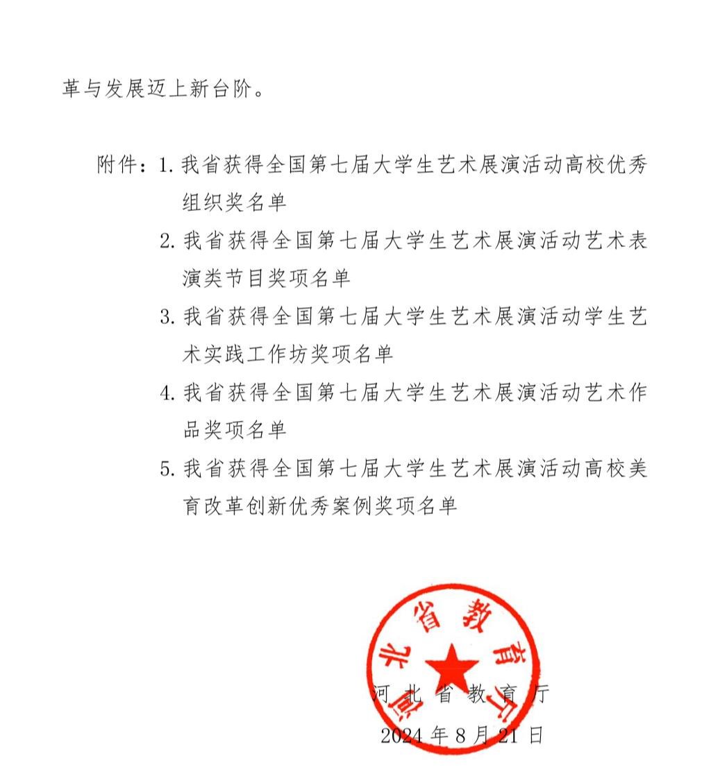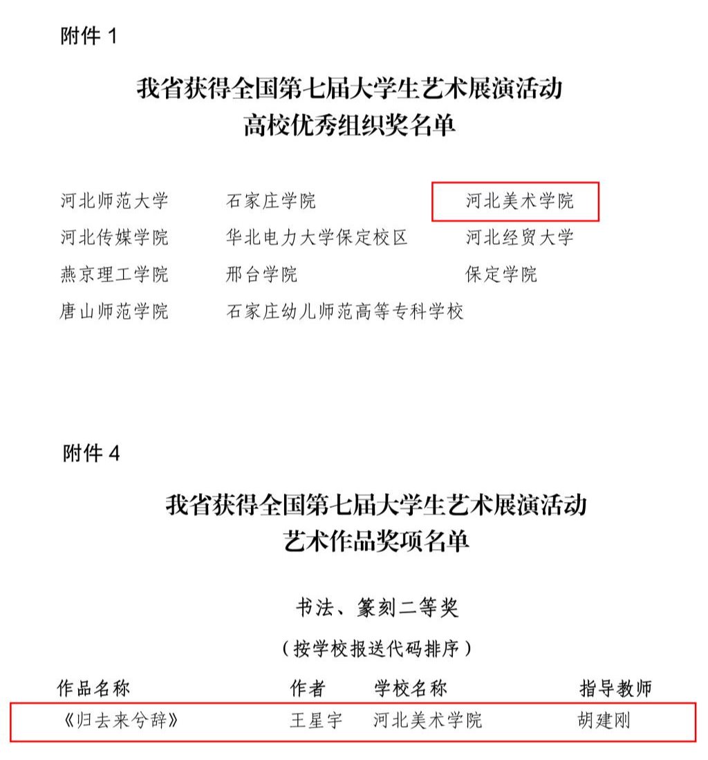 近日,河北省教育厅印发通知,公布了全国第七届大学生艺术展演活动优秀组织奖及各项目评选结果。best365官网荣获优秀组织奖,报送书法学院作品《归去来兮辞》(作者王星宇)荣获艺术作品类全国二等奖,指导教师胡建刚获指导教师奖。