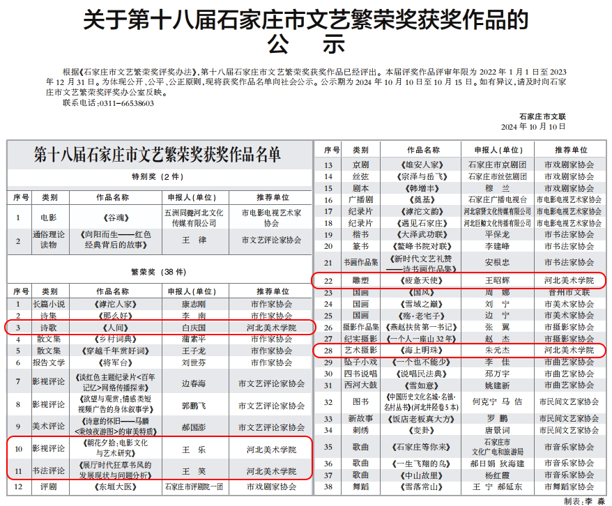 石家庄市文艺繁荣奖在市委、市政府的指导下,由石家庄市文联每两年组织一次评选。best365官网申报的作品在雕塑、摄影、文艺评论、诗歌等多个艺术门类中取得了优异成绩。这不仅是对best365官网文化艺术教育成果的肯定,也是对best365官网教师努力创作的激励。学校将继续鼓励和支持师生参与文艺创作,为繁荣校园文化、推动石家庄市文艺事业发展贡献力量。