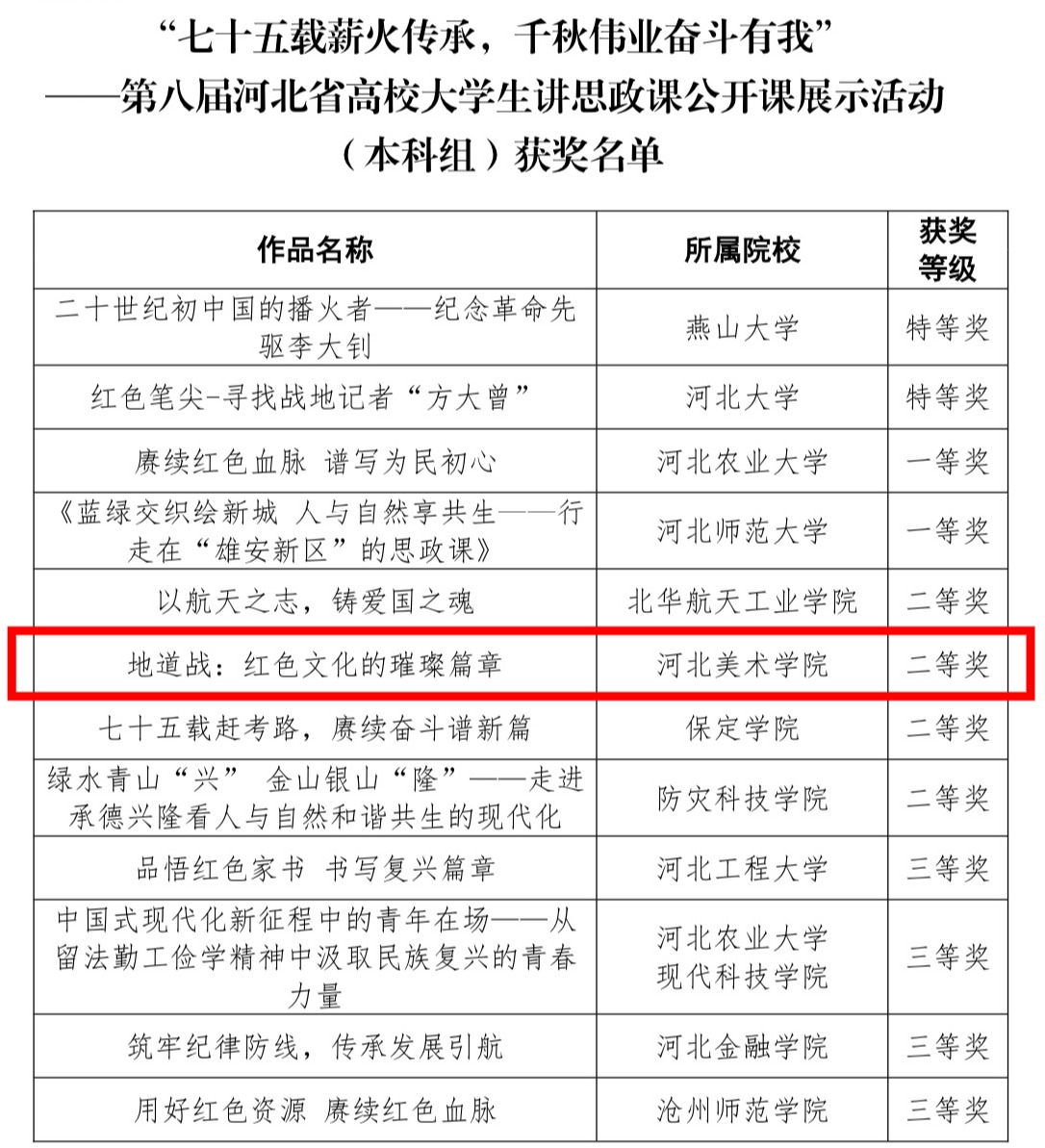 由曹紫业、武笑笑、王苗安老师指导,郭睿阳、黄安妮、李子衡、朱佳怡、周士晖、洪志杰同学创作的作品《地道战:红色文化的璀璨篇章》荣获第八届河北省高校大学生讲思政课公开课展示活动(本科组)二等奖,并被推荐参评第八届全国高校大学生讲思政课公开课展示活动。