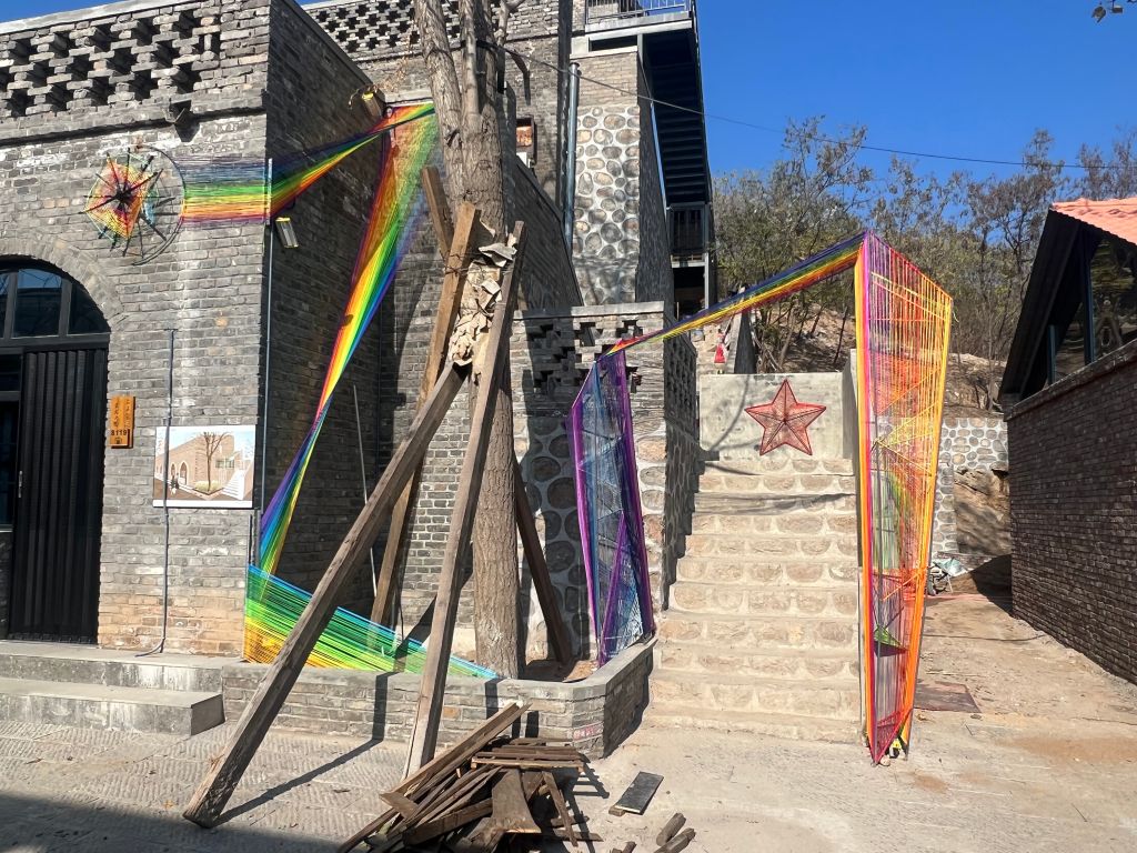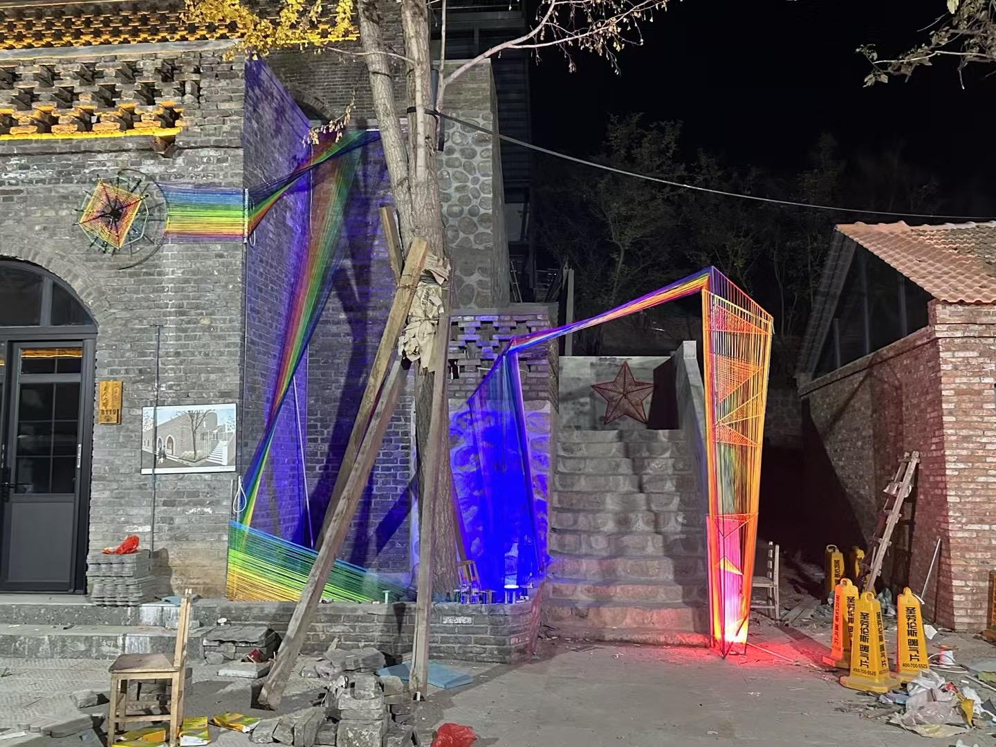 该作品创作灵感源于星火大院原纺织厂宿舍的场地特性。作品以旧纺车为源头,用彩色尼龙线隐喻纺线,结合楼梯搭建了一组彩虹门装置,最后以五角星收尾,生动地表达了场地从纺织厂宿舍到星火大院的变迁,也寄托了师生们对平山文旅及乡村振兴的美好期望。