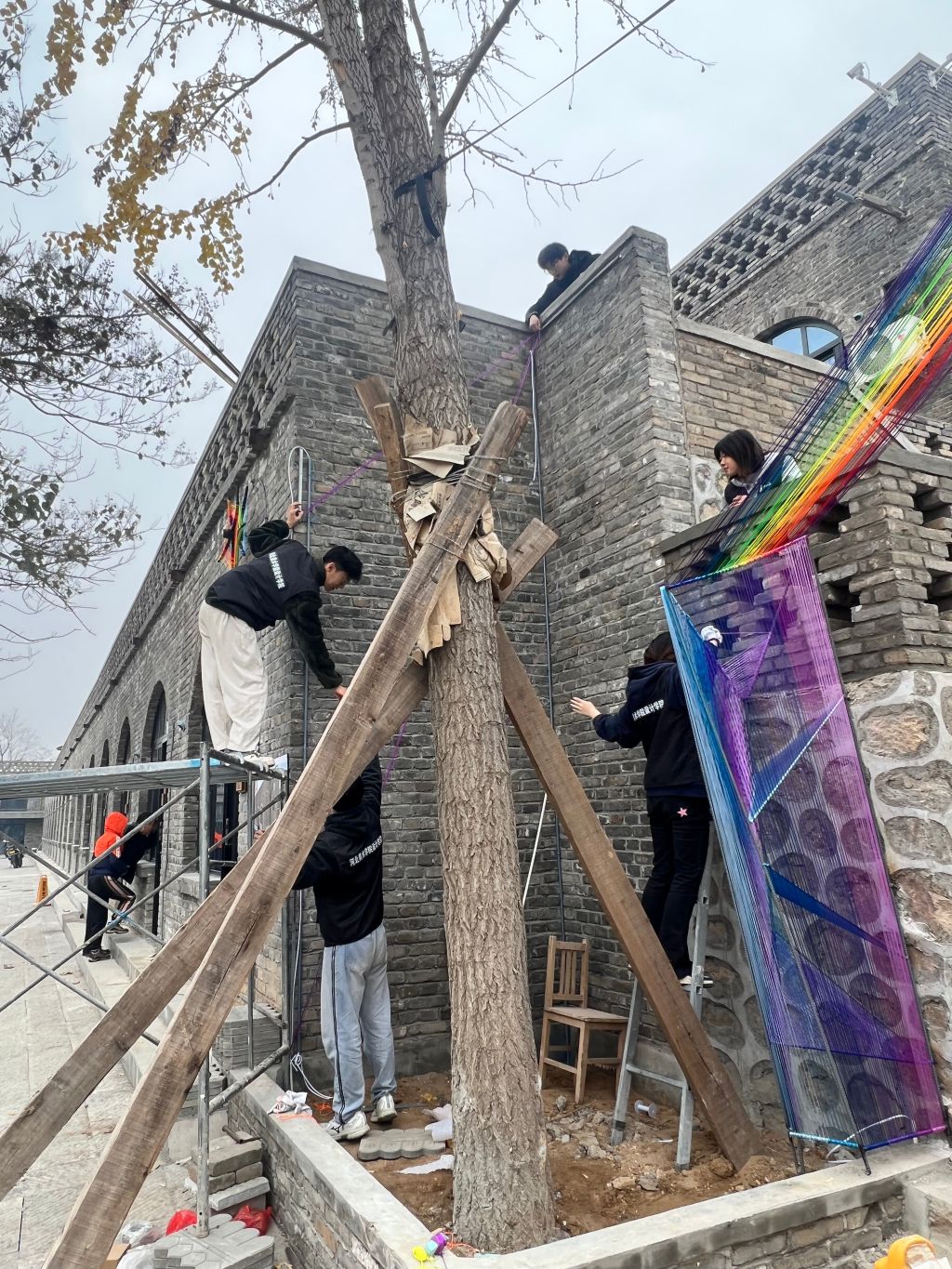 在现场搭建及编织过程中,师生们不断遇到问题,积极解决问题,通过调整线性走向、改进编织方式、优化固定模式,每一个细节都凝聚着他们的智慧和汗水。经过为期5天的不懈努力,最终手工编织出约3000米彩色尼龙线,呈现出一组绚丽的作品,并在十余组作品中脱颖而出。