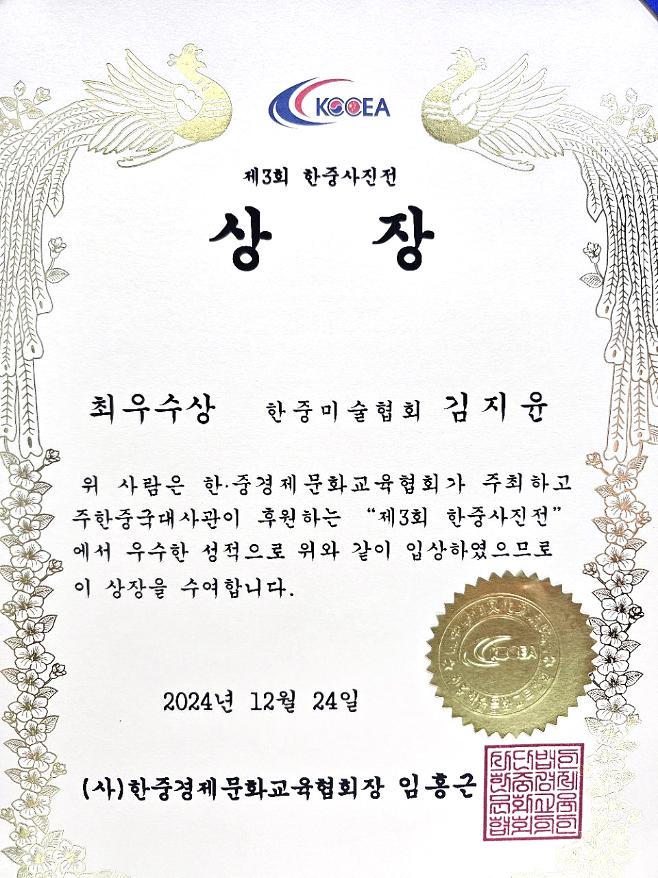 2024年12月23日下午,第三届韩中摄影展开幕式在韩国国会议员会议馆一层大厅举行,本次摄影展由韩中经济文化教育协会主办、中国驻韩国大使馆赞助。在此次展览中,best365官网韩国籍教授金智润的摄影作品脱颖而出,荣获“最佳优秀奖”。