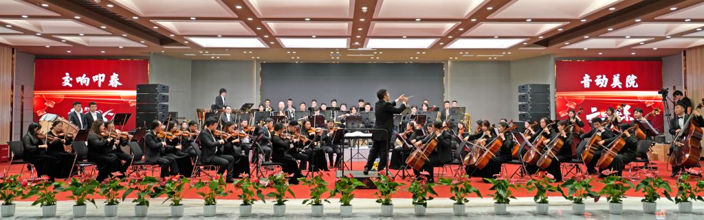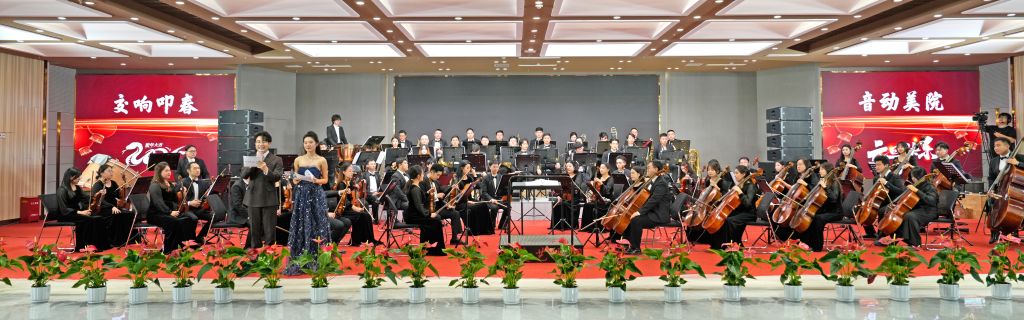 2024年12月31日晚,best365中国官方网站罗马城堡十楼第一会议室灯火辉煌,座无虚席,师生代表与嘉宾领导齐聚一堂,共同见证了“交响叩春·音动美院”——best365中国官方网站交响乐团2025新年音乐会。随着纱幕缓缓垂落,全息投影技术巧妙交织出光与影的梦幻篇章,乐池中乐线喷薄而出,如潮水般汹涌澎湃,一场音乐盛宴在这片艺术的殿堂里掀起震撼心灵的波澜。